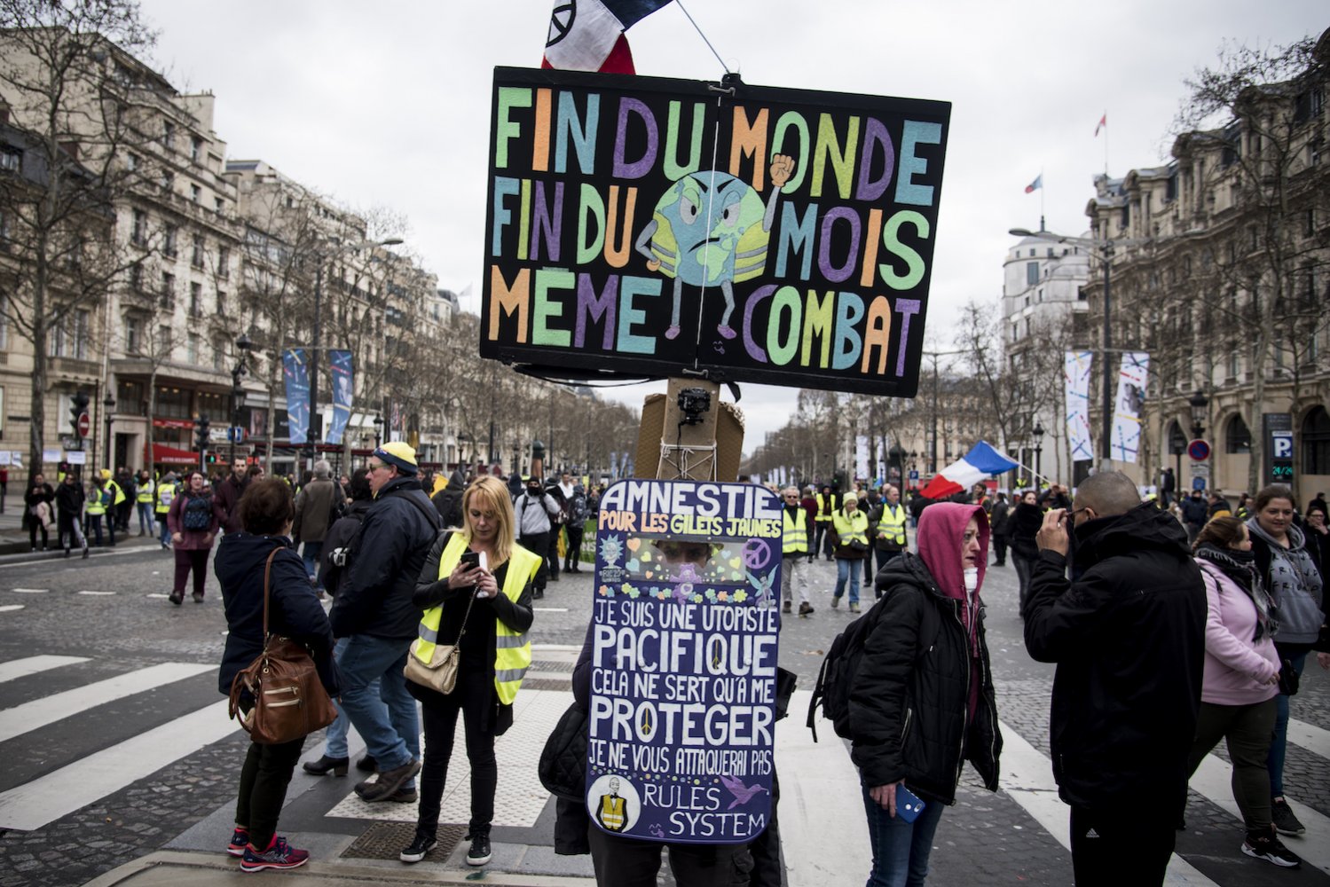 Le samedi 16 mars a été une journée chargée sur le front des mobilisations. Le matin, les Gilets jaunes se sont retrouvés sur les Champs-Élysées. À 13 h, familles de victimes des violences policières, habitants des quartiers populaires, exilés et des Gilets jaunes se sont élancés de la place de la Madeleine pour une grande « marche des solidarités ». À 14 h, ils ont croisé les 100.000 personnes de la « marche du siècle » pour le climat, qui se dirigeaient vers la place de la République. Reporterre était présent à chaque instant de cette journée de manifestations de grande ampleur. Reportage en images.