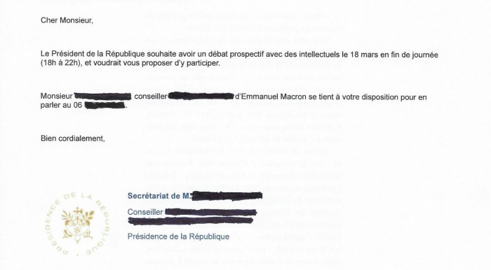 Vous comprendrez que si c'est pour venir faire tapisserie le petit doigt en l'air au milieu des pitres façon BHL, Enthoven, ou des intellectuels de cour comme Patrick Boucheron [2], je préférerais avoir piscine ou même dîner avec François Hollande. Au moins votre invitation ajoute-t-elle un élément supplémentaire pour documenter votre conception du débat. Savez-vous qu'à part les éditorialistes qui vous servent de laquais et répètent en boucle que la-démocratie-c'est-le-débat, votre grand débat à vous, personne n'y croit ? Vous-même n'y croyez pas davantage. Dans une confidence récente à des journalistes, qui aurait gagné à recevoir plus de publicité, vous avez dit ceci : « Je ressoude, et dès que c'est consolidé je réattaque ». C'est très frais. Vous ressoudez et vous réattaquez. C'est parfait, nous savons à quoi nous en tenir, nous aussi viendrons avec le chalumeau.