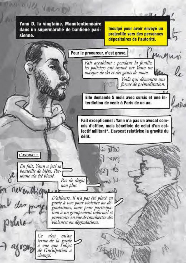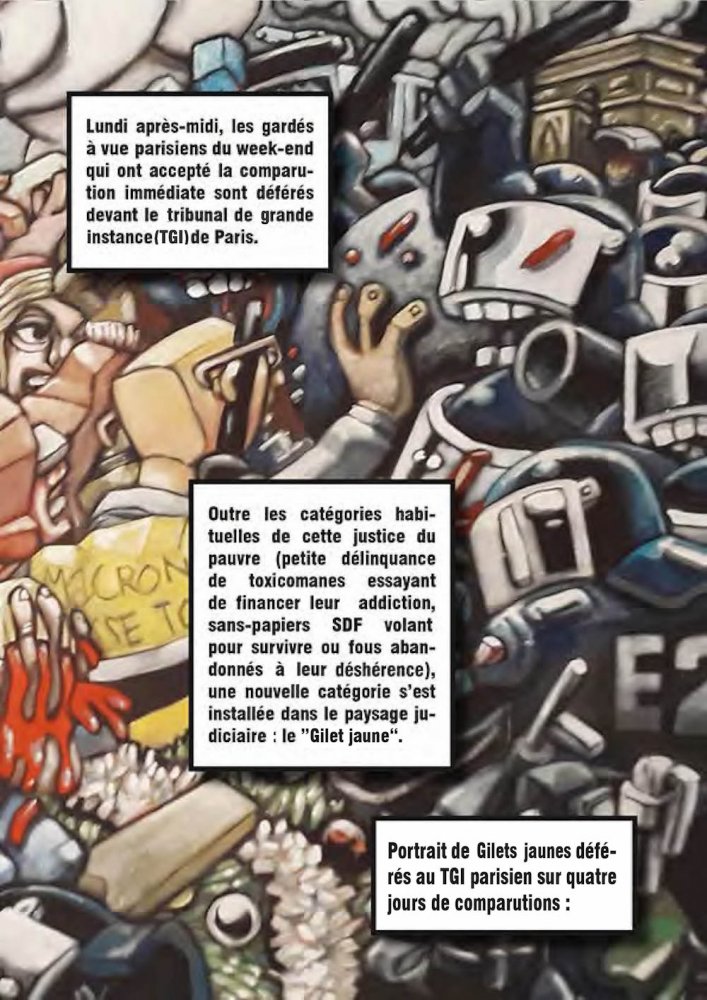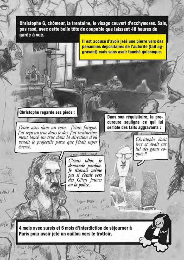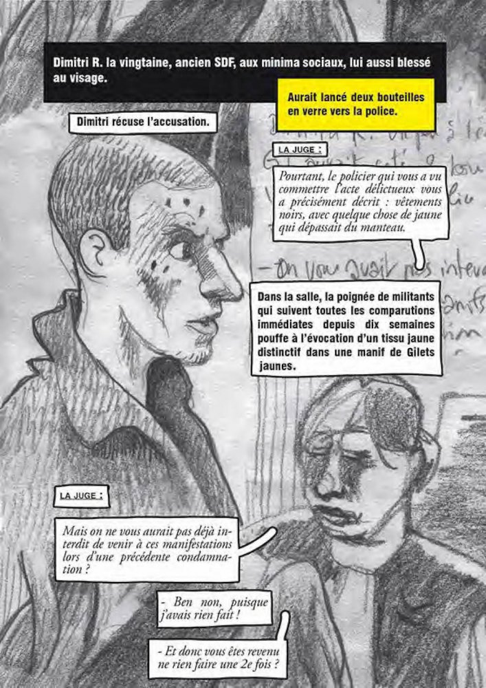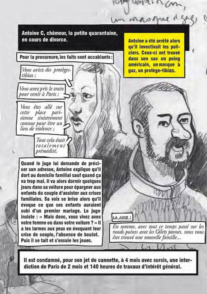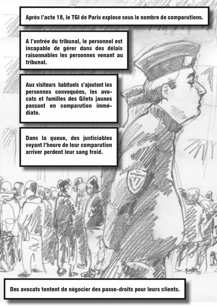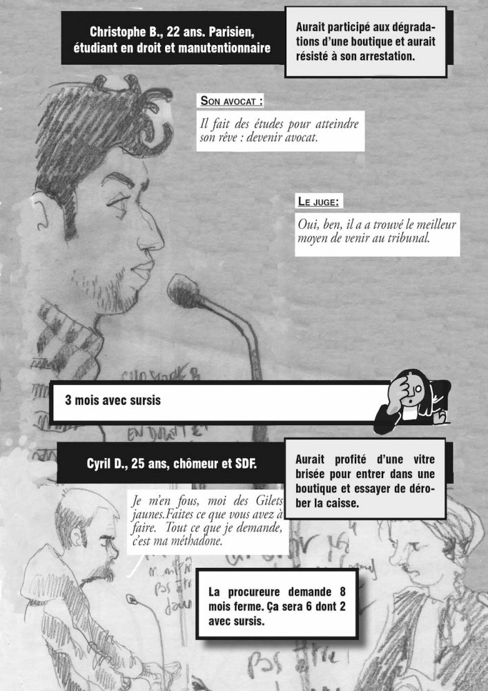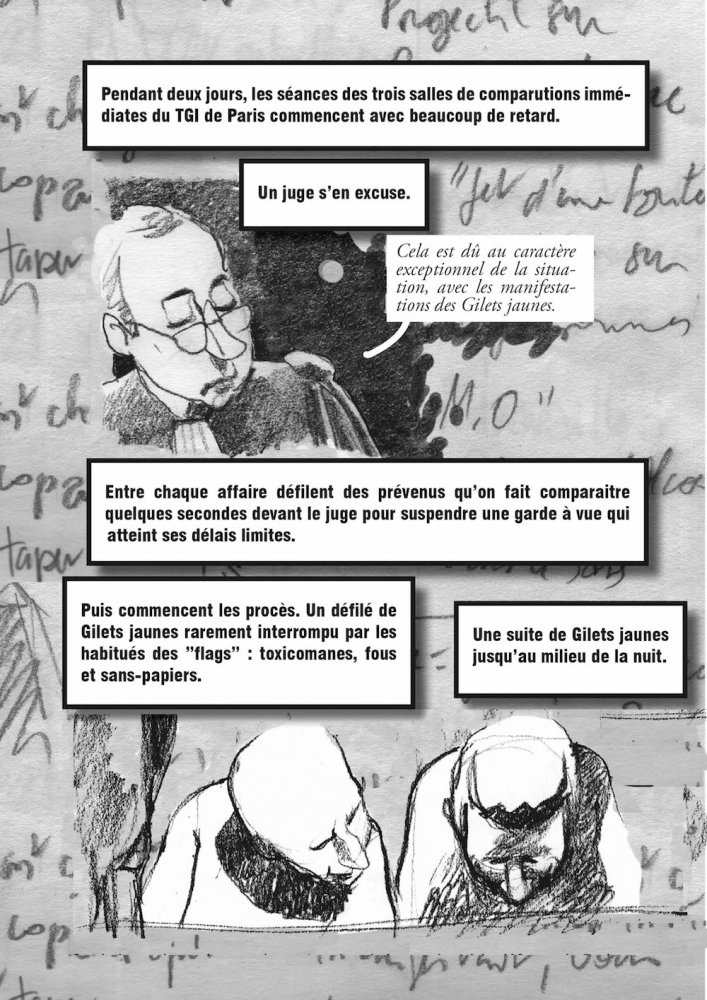 La réponse policière au mouvement des Gilets jaunes se double d'une réponse judiciaire. Depuis le 1er décembre, les manifestants arrêtés le samedi passent en comparution immédiate la semaine qui suit. Au tribunal de grande instance de Paris, la cadence est intense et les condamnations pleuvent. Reportage dessiné de cinq journées d'audience entre le 21 janvier et le 19 mars.