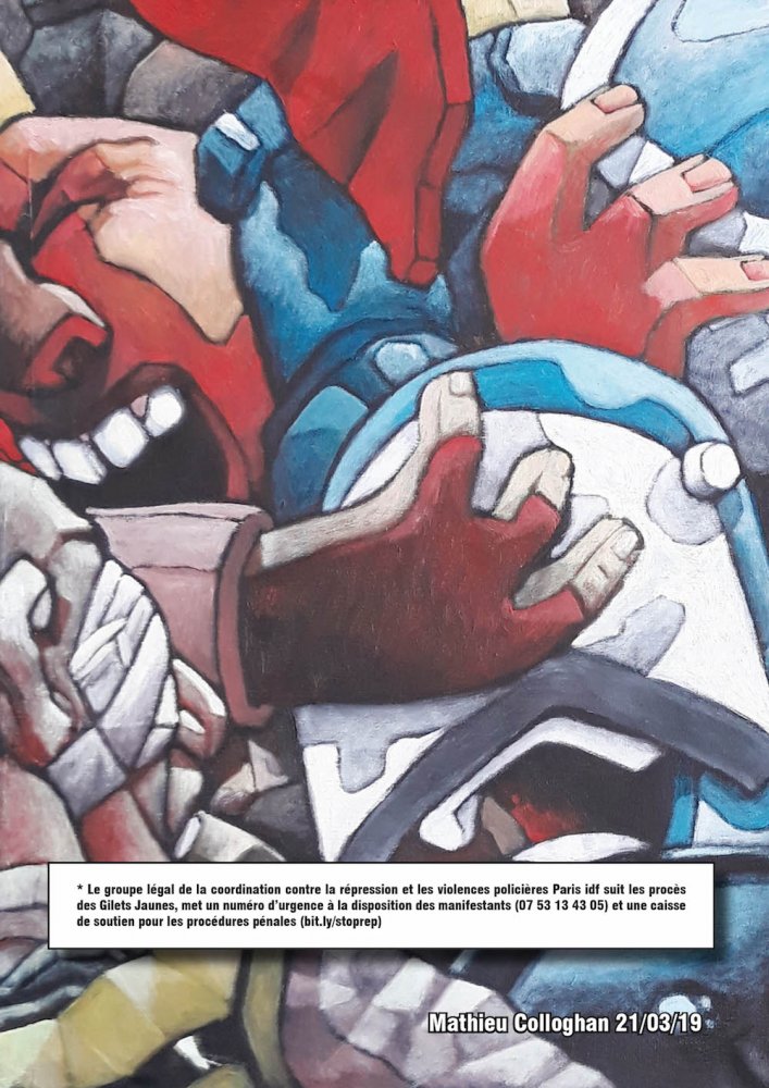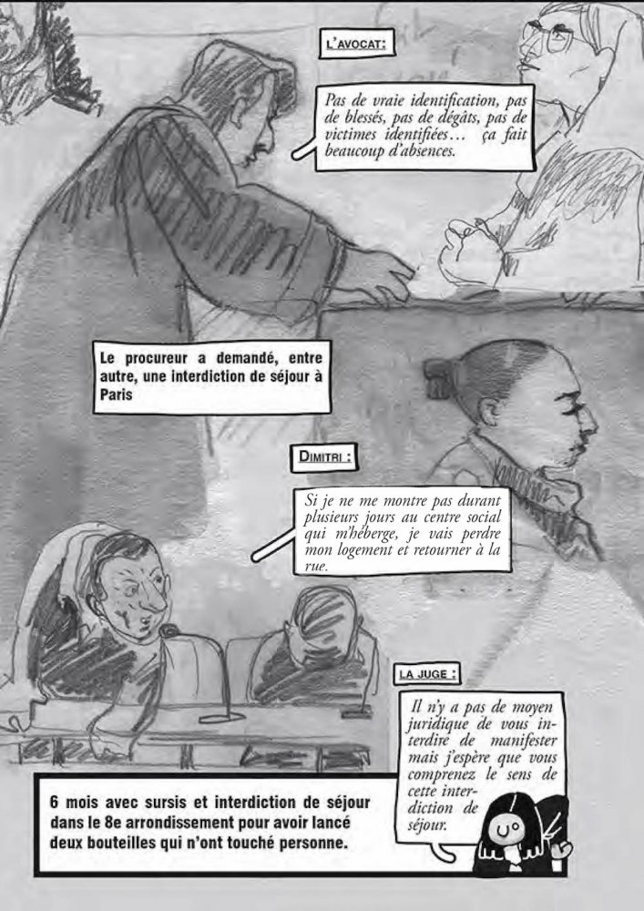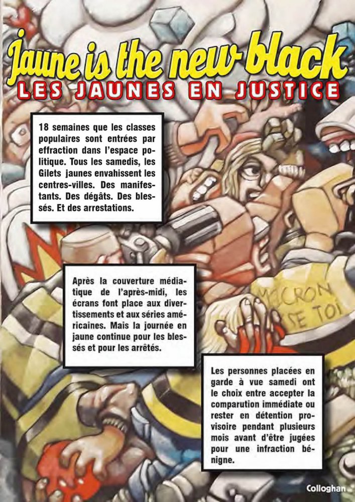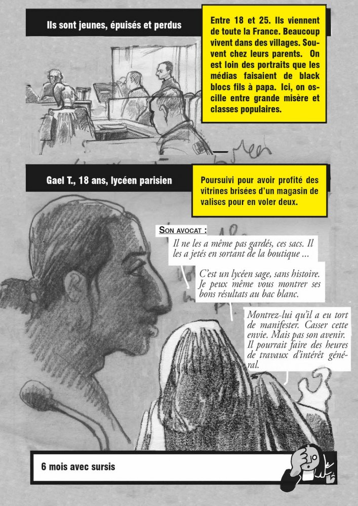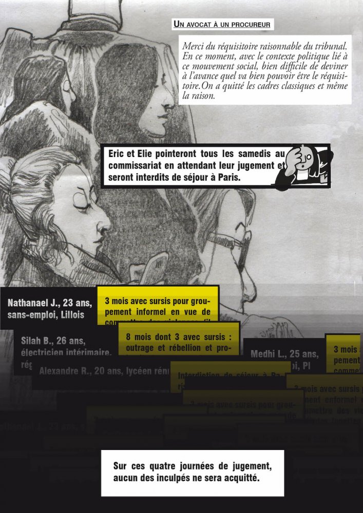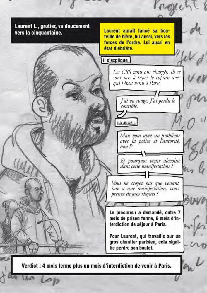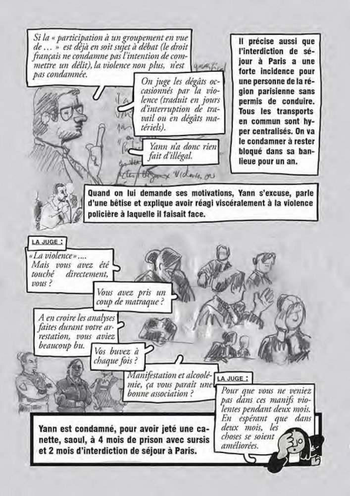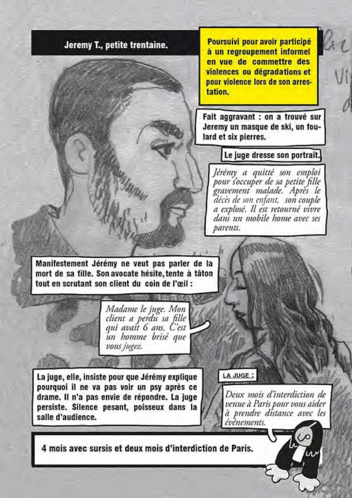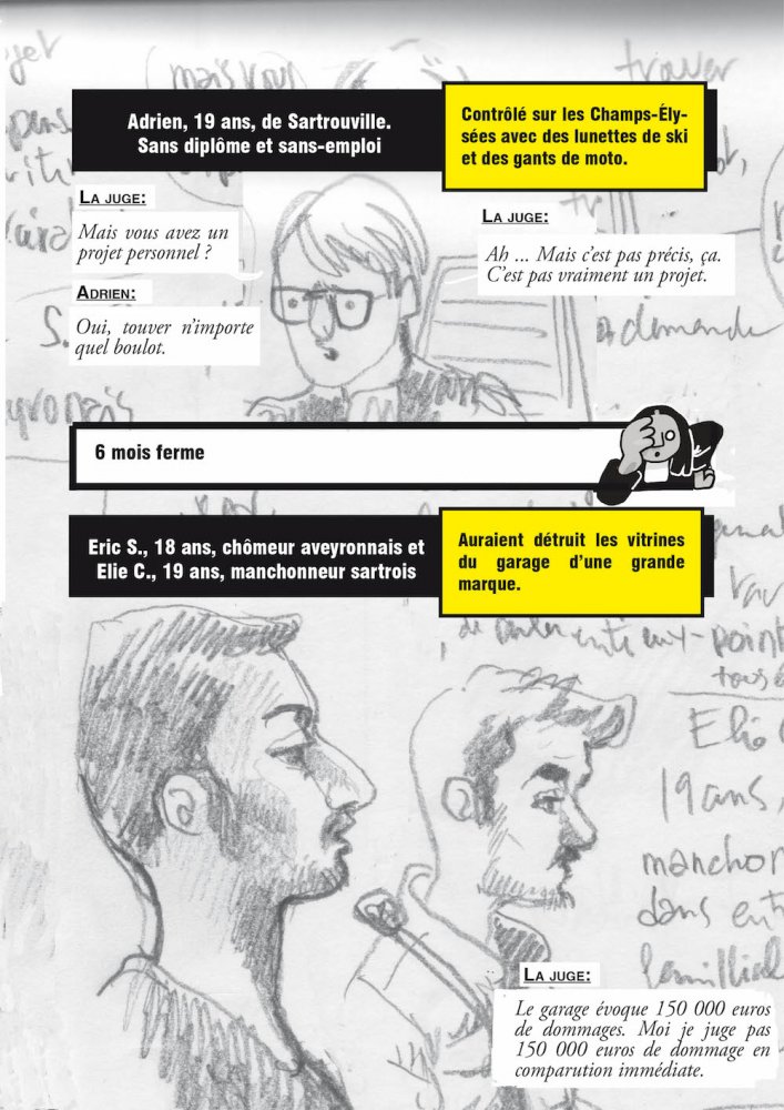 La réponse policière au mouvement des Gilets jaunes se double d'une réponse judiciaire. Depuis le 1er décembre, les manifestants arrêtés le samedi passent en comparution immédiate la semaine qui suit. Au tribunal de grande instance de Paris, la cadence est intense et les condamnations pleuvent. Reportage dessiné de cinq journées d'audience entre le 21 janvier et le 19 mars.