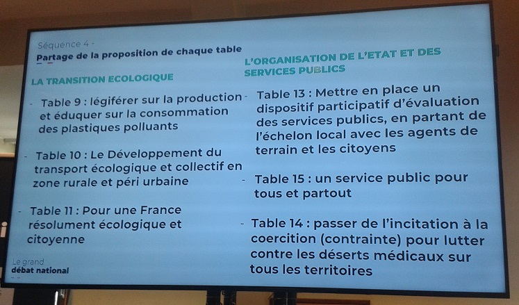 A la table de la petite souris, ils étaient 6 (plus elle), 5 participants et une facilitatrice qui restera assez neutre, professionnelle. Les cinq participants étaient des couches moyennes, pas très jeunes. Pas d'ouvrier, le tirage au sort a éludé cette classe sociale qui pèse démographiquement lourd (le hasard est le procédé par lequel le Diable de l'Elysée se manifeste en ricanant).