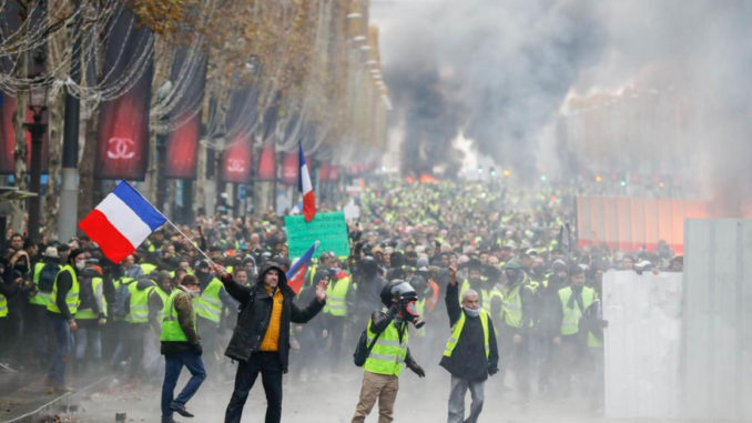 Macron pousse la logique plus loin. Des décennies de politique ultralibérales dictées par l’oligarchie ont appauvri le peuple français. Face à sa détresse et à la colère légitime qui en découle, il se drape dans le mépris et l’arrogance et utilise la violence d’État pour les réprimer. Et, comme cela ne suffisait pas, il fait maintenant entrer l’armée dans la danse. Le peuple français serait donc l’ennemi de la nation ? Cette thèse est très peu probable si l’on en juge au nombre de drapeaux tricolores qui flottent dans les manifestations des Gilets Jaunes. C’est là le signe d’un système à bout de souffle.