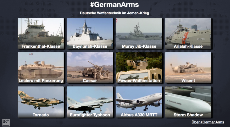 Ils ont ainsi constaté que l'armée saoudienne a installé à la frontière avec le Yémen des batteries d'artillerie de type Caesar. Ces canons longue portée sont fabriqués par le groupe français Nexter et équipés de châssis produits par Mercedez-Benz. « Sur des vidéos, on voit des Caesar tirer. Avec une portée de plus de 40 kilomètres, les obusiers peuvent tirer sur le territoire du Yémen depuis cette position », écrivent les journalistes sur le site du collectif #GermanArms. Entre 2010 et 2015, l'entreprise française Nexter a livré plus de 100 dispositifs d'artillerie de ce type à l'Arabie Saoudite [4].