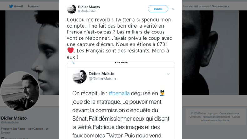 Le président de Sud Radio Didier Maïsto s'est indigné de la suspension de son compte Twitter. En cause selon lui, sa réponse à des moqueries sur la blessure à l'œil du Gilet jaune Jérôme Rodrigues, interprétée par Twitter comme une menace.