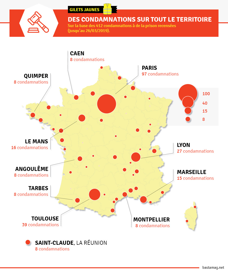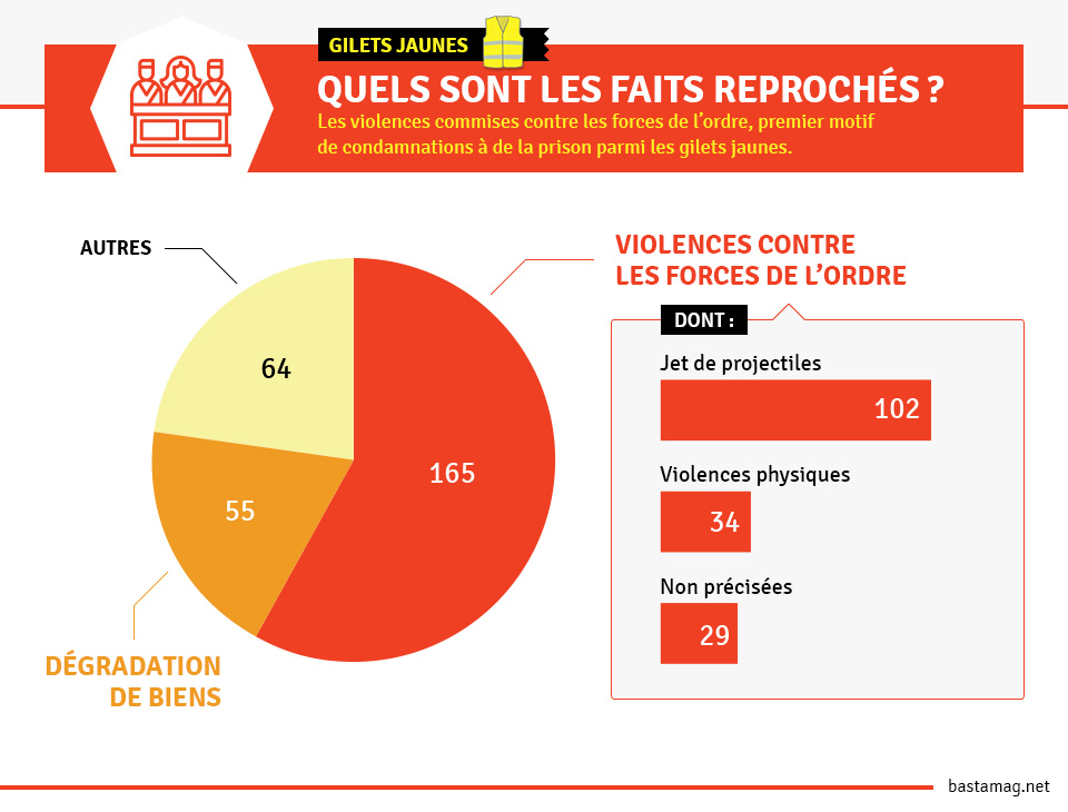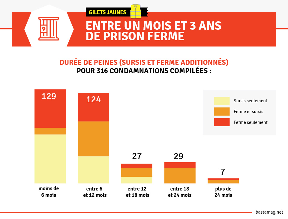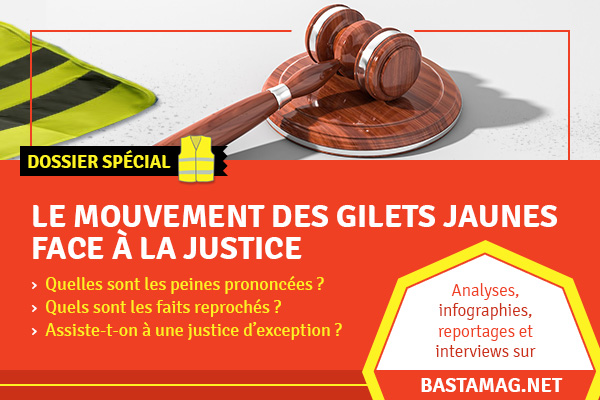 | Pendant plusieurs semaines, Basta ! s'est plongé dans les centaines de condamnations de gilets jaunes à de la prison, pour en connaitre les raisons. Retrouvez une première analyse du traitement judiciaire des gilets jaunes ici. Et notre base de données, non exhaustive, est à découvrir en ligne sur cette page. |