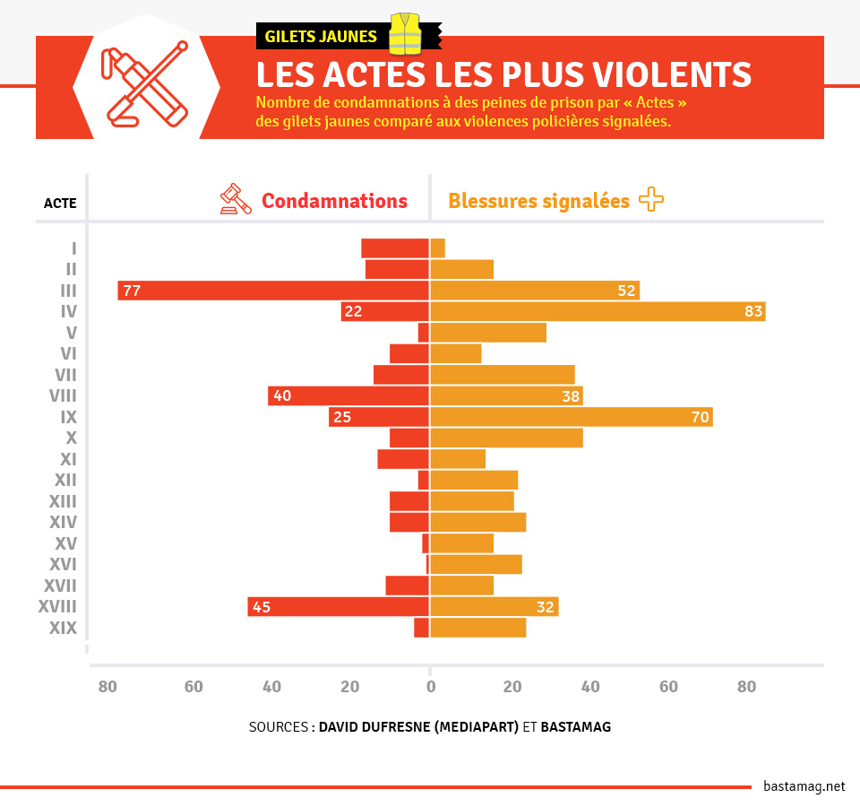 Nous avons également comparé le nombre de condamnations par actes avec les signalements de violences policières répertoriés par le journaliste David Dufresne pour Mediapart. Cela permet de mesurer le niveau de violence de certaines journées de manifestations, par le nombre de signalements de manifestants blessés et celui des personnes interpellées puis condamnées à des peines de prison. Il ne s'agit bien évidemment pas de justifier a posteriori les violences commises par les forces de l'ordre au regard du nombre de condamnations prononcées ensuite, ni celles commises par les manifestants au regard du nombre des violences policières signalées.