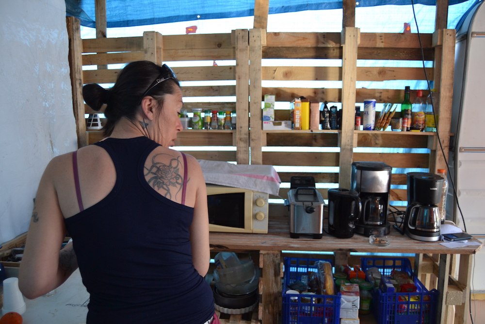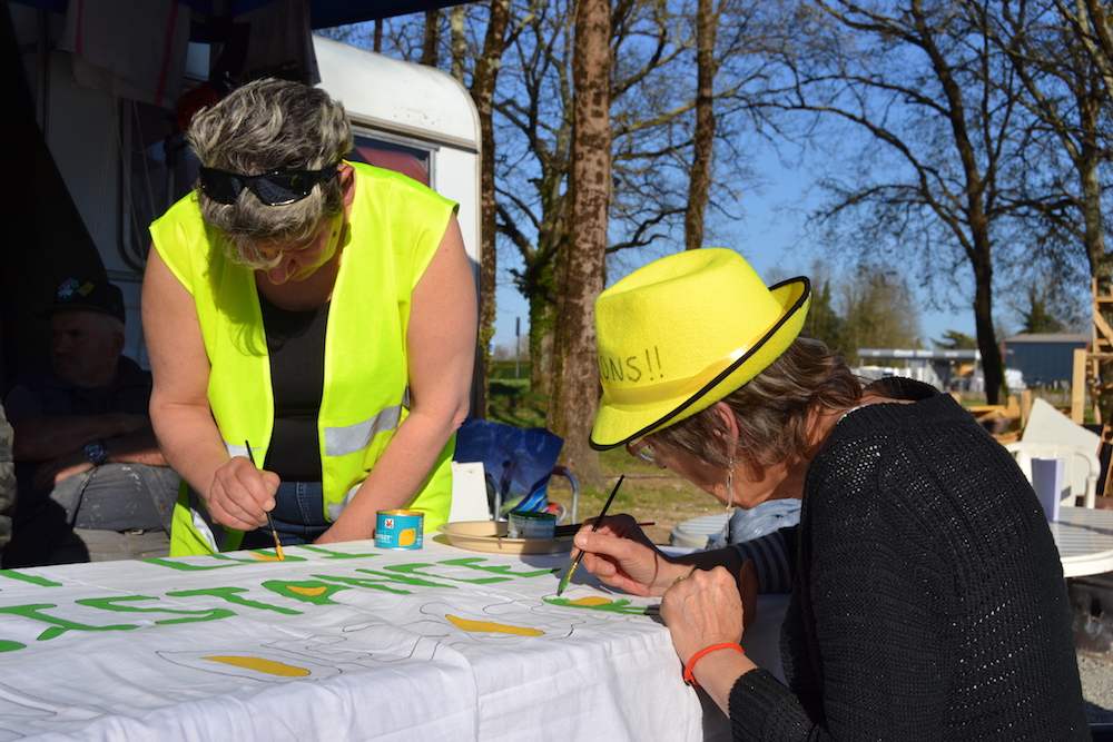 Pour celles et ceux qui restent au QG, pas question de lambiner au soleil. Nadine arrive avec un grand sac rempli de bouteilles en plastique de récupération remplies d'eau du robinet. Pascale, écouteurs sur les oreilles, s'attaque à la vaisselle dans deux grandes bassines en métal ; Angélique « Angèle » et Julien s'emparent de torchons pour lui prêter main-forte. De retour de la librairie, Sarah poursuit la peinture de la banderole, sur laquelle les lettres forment un immense « Quand l'injustice devient loi, la résistance est un devoir » ; bientôt, Nadine attrape un pinceau elle aussi. « On entend beaucoup de gens dire que tout ça ne sert à rien, commente-t-elle en remplissant minutieusement une lettre de peinture verte. Mais si on n'essaie pas, si on baisse les bras, on n'aura jamais rien ! » Plus loin, Christophe et Julien entreprennent d'installer leur précédente réalisation une autre banderole proclamant que « Celui qui ne se rebelle pas n'a pas le droit de se lamenter ». Plus tard, des petites croix viendront orner le rond-point, « pour les onze personnes décédées depuis le début du mouvement », explique Sarah. « Pour Zineb Redouane, la vieille dame décédée après s'être pris une grenade lacrymo en plein visage, j'aimerais une croix noire avec des lettres jaunes, parce que c'est la police qui l'a tuée. Aucun mot de Macron là-dessus, d'ailleurs. Pas même un ''elle aurait dû avoir la sagesse de ne pas fermer ses volets'' ! » ironise-t-elle.