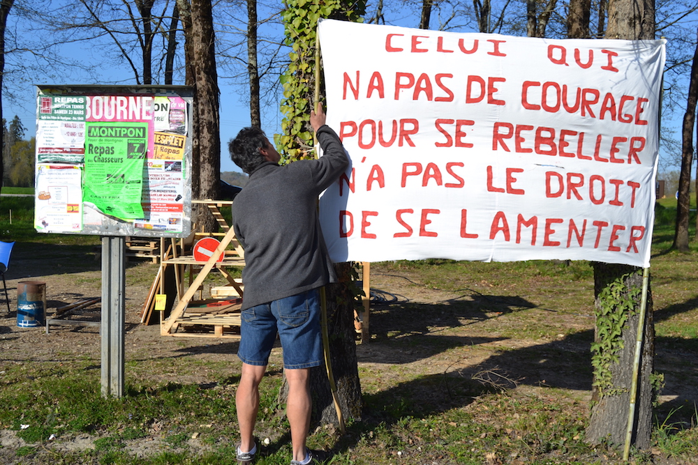 En effet, la veille, la bonne quinzaine de Gilets jaunes présents à la réunion ont voté pour l'organisation d'une réunion publique avec les habitants de Montpon « tout se décide au vote à main levée, précise Christophe. À chaque fois que les flics sont venus pour nous expulser, on a voté à main levée devant eux pour savoir si on partait ou pas et où on se réinstallait, et on a appliqué la décision ». Plusieurs Gilets jaunes avaient participé aux trois réunions organisées par Montpon dans le cadre du « grand débat national » et en étaient sortis écœurés. « On nous a posé des questions et nous devions trouver les solutions, autrement dit, faire le travail de l'État, ironise Sarah. Lors de la réunion consacrée à l'écologie, quand nous avons revendiqué le principe du pollueur-payeur, l'animateur nous a répondu que c'était un slogan publicitaire ! À la troisième réunion, sur la citoyenneté, la démocratie, la laïcité et l'immigration, j'ai dû expliquer la différence entre vote blanc et abstention. À une autre réunion, à Port-de-Couze, Christophe a interpellé le député Michel Delpon sur le fait qu'il avait voté pour la loi "anticasseurs". »