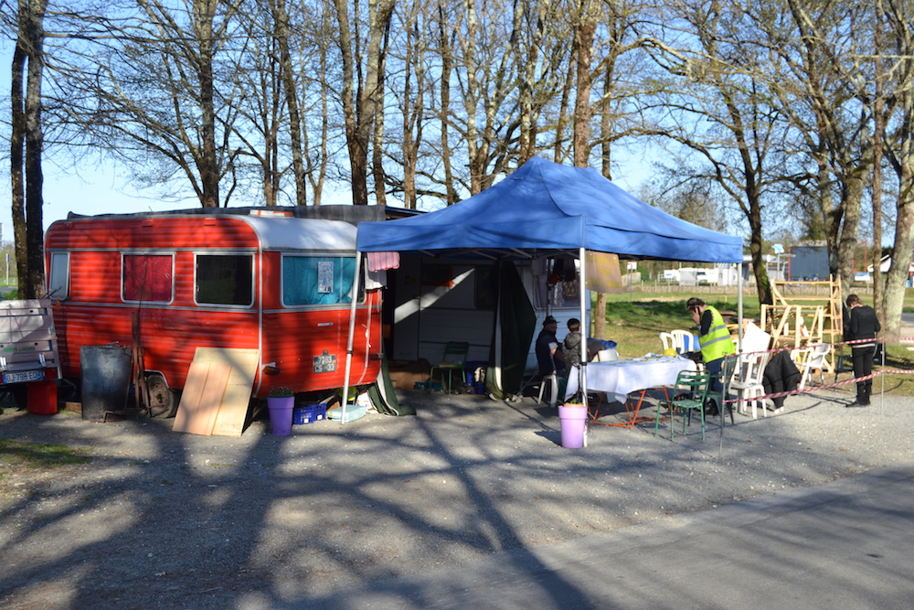 « Bien dormi ? Tu prends le café ? » À 7 h 30 du matin, le soleil radieux illumine déjà l'intérieur de la caravane. Cette nuit-là du mercredi 27 mars, ce sont Jean et Thibault qui ont dormi au QG des Gilets jaunes de Montpon-Ménestérol (Dordogne), devant le supermarché discount Netto de Ménesplet (Dordogne) un roulement, noté dans un cahier d'écolier, a été établi pour que les deux caravanes ne restent jamais vides. La réunion hebdomadaire de la veille s'est prolongée tard dans la nuit, mais Jean, rejoint entre-temps par Gilles, a déjà rallumé le feu et lancé la cafetière. « Avec Thibault, on s'est couché à l'aube. Ça pique un peu », avoue-t-il, en passant la main sur son menton couvert d'une ombre de barbe. La routine, ou presque, depuis qu'ils ont récupéré les caravanes et installé leur campement, le 5 janvier dernier.