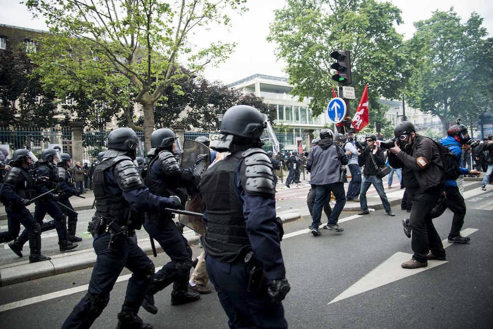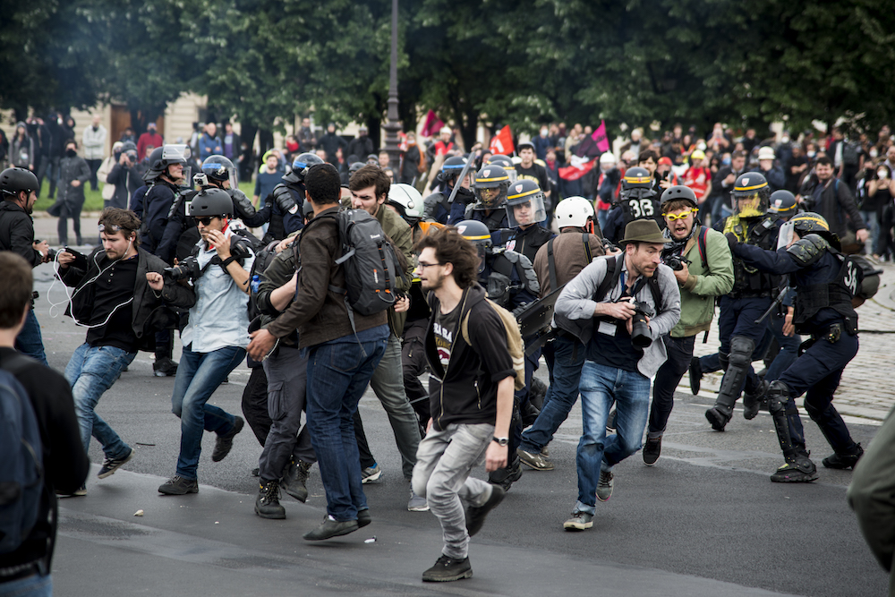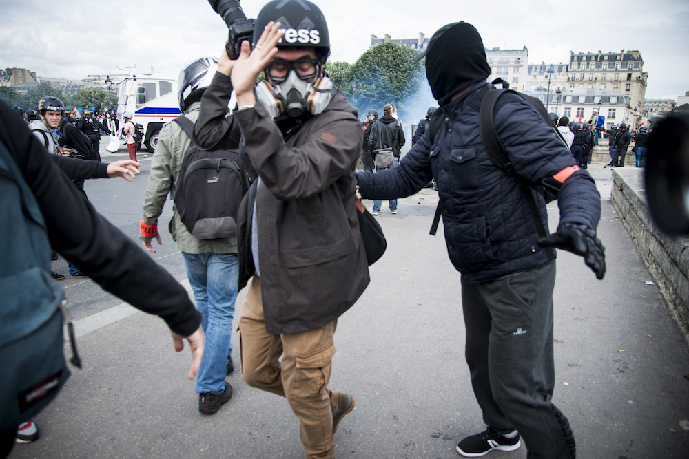 Un photojournaliste, avec un brassard comportant sa carte de presse, prend les forces de l'ordre en photo lors des manifestations contre la loi travail.