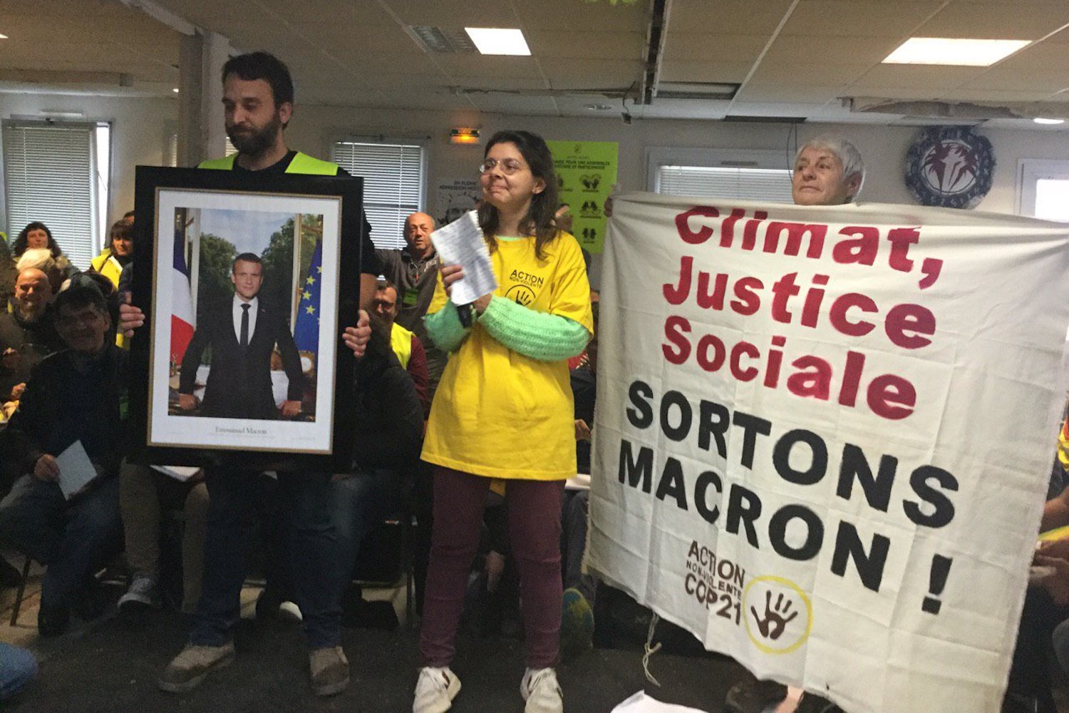 La violence de l'Etat semble accroître la détermination des Gilets jaunes plus que l'affaiblir. Tout le week-end de Saint-Nazaire a été innervé par la volonté tenace de refaire démocratie, de rétablir la justice, et de changer un système nuisible à l'écologie comme aux humains. Une écologie bien présente, avec des ateliers spécifiques... et la surprise dimanche quand Macron a surgi ! Enfin, son portrait, apporté sous les acclamations par le GIGNV (Groupe d'intervention des grenouilles non violentes), un groupe local d'ANV - COP21, rappelant que la lutte contre Macron se conjugue au combat pour le climat.