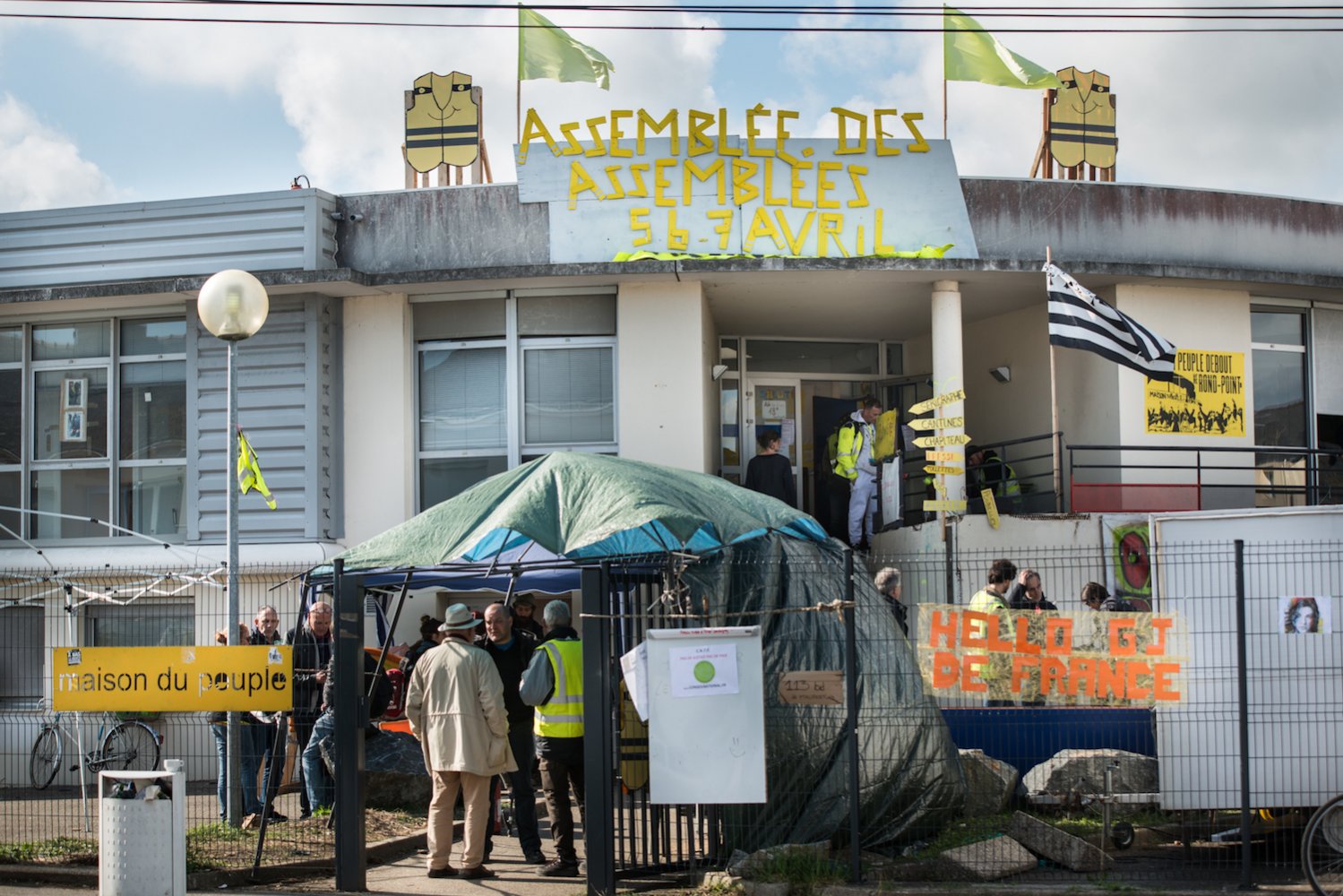 Ce sont près de 800 personnes délégués de 200 groupes locaux, observateurs non mandatés, bénévoles, journalistes qui se sont retrouvées vendredi 5 avril dans « la Maison du peuple », une ancienne agence pour l'emploi occupée depuis plusieurs mois par les Gilets jaunes de Saint-Nazaire. La mairie avait refusé de prêter un local, et fait pression sur les communes avoisinantes pour empêcher toute aide, si bien que les Gilets jaunes de la ville portuaire ont choisi de tenir l'assemblée dans leur maison.