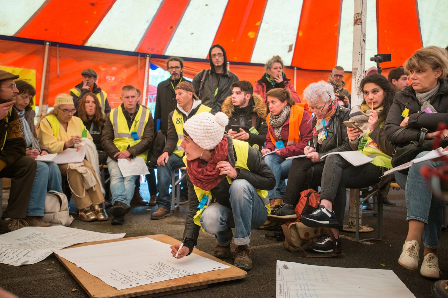 En quelques semaines, ils en ont abattu les murs internes pour faire de la place, et installé des chapiteaux tout autour, dans le terrain dégagé qui entoure le bâtiment principal. Si bien qu'avec beaucoup d'aides de partout, de cantines délicieuses et militantes, de toilettes sèches, de centaines d'hébergements organisés dans la ville, et malgré la pluie presque incessante, les Gilets jaunes ont débattu pendant deux jours et demi, en plénière ou en groupes thématiques, avec une assiduité et un sérieux impressionnant.