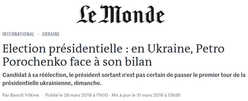 « En réalité, et c'est une première en Ukraine, le scrutin ne met pas aux prises pro-européens et prorusses - le candidat représentant cet électorat, Iouri Boïko, est relégué à une lointaine quatrième place -, mais ce qu'il faut comprendre, c'est que face à un Zelenski inexpérimenté et une Timochenko réputée trop souple face au Kremlin, seul le président peut tenir le cap « euro-atlantique ». Aucun costume ne lui sied mieux que celui de commandant en chef des armées. [...]