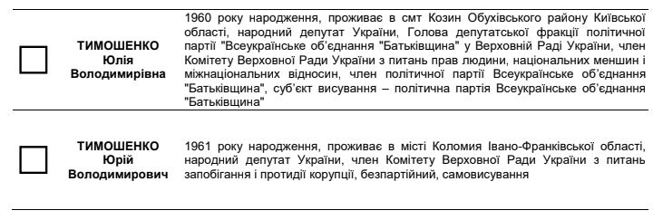 Sur le bulletin de vote, les noms des deux candidats Timochenko sont quasi-identiques. Le second, quasiment inconnu, a quand même réalisé la 10e performance, avec 0,62 % des voix...