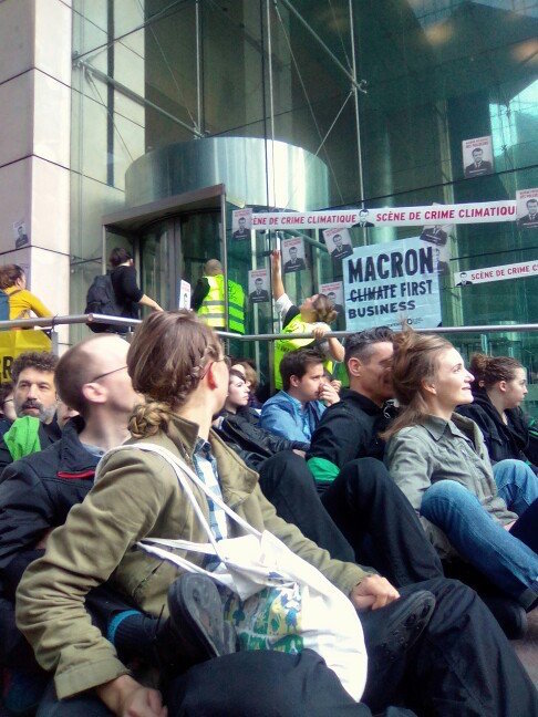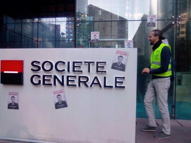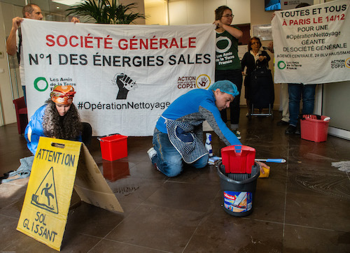 9 h 30 Société Générale : Les activistes crient « Écologie libérale, mensonge du capital ! ». La porte d'entrée vient d'être brisée par accident, mais la seconde entrée est toujours bloquée. L'ambiance est tendue entre les salariés et les manifestants.