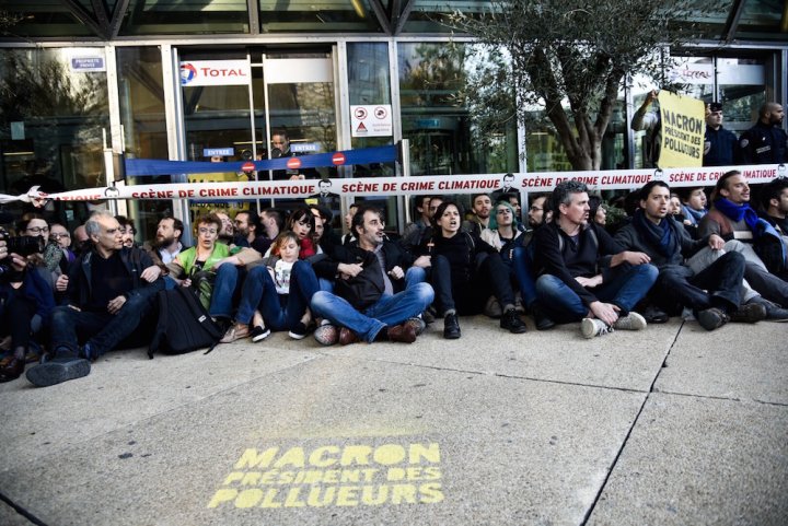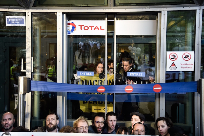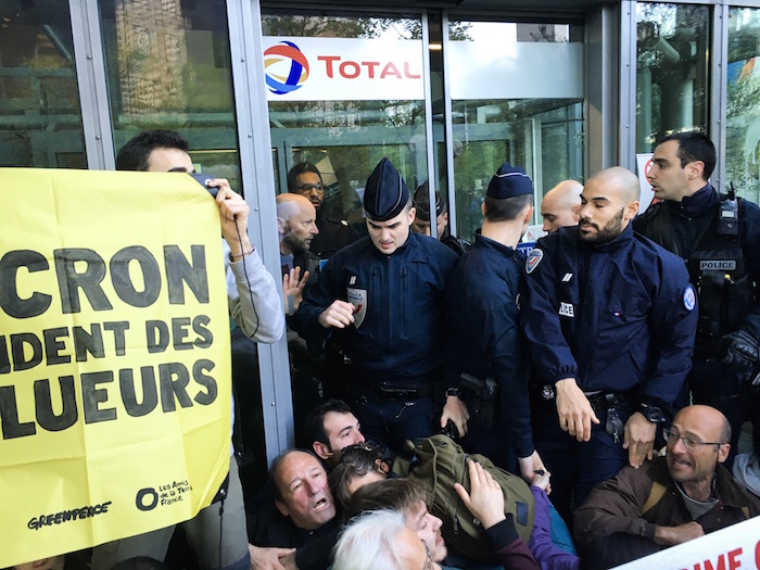 9 h 18 Total : La police arrive en plus grand nombre et rentre dans le bâtiment, armée. Les militants craignent pour leurs camarades présents à l'intérieur. 2.300 citoyens sont mobilisés pour l'action, répartis en quatre lieux : EDF, Total, Société Générale et ministère de la Transition écologique et solidaire.