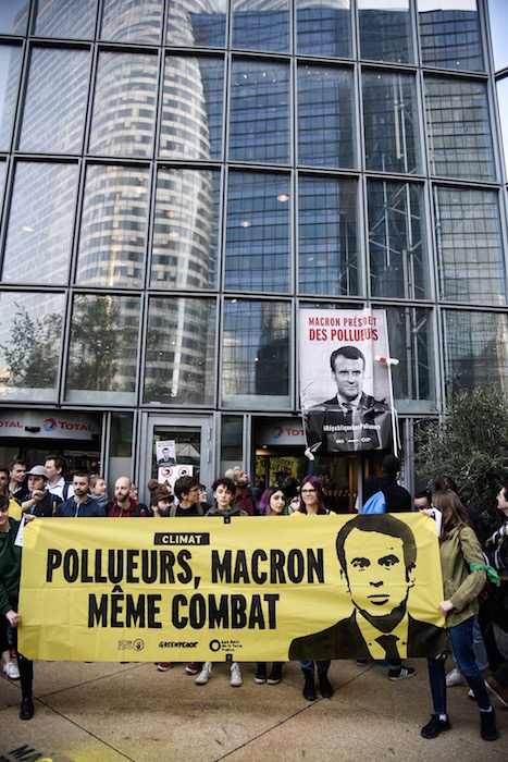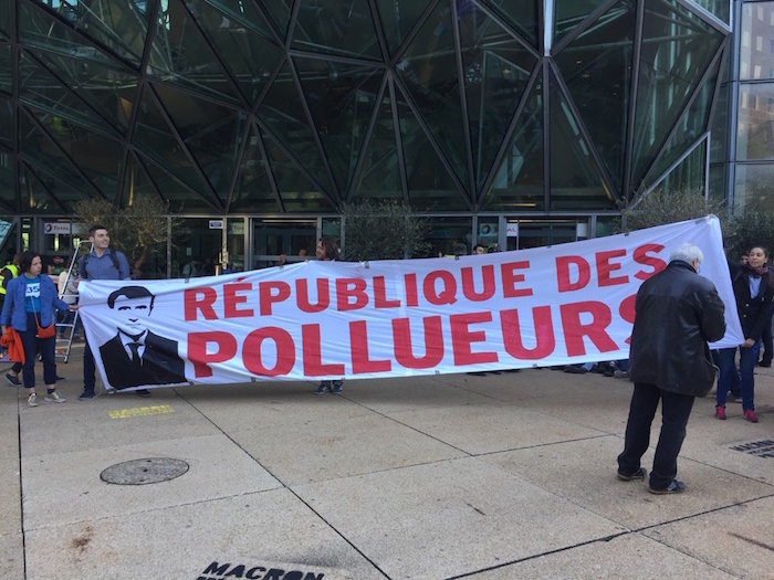 Devant le ministère de la Transition écologique, les militants ont opté pour « une galerie des patrons de grandes entités polluantes, pour symboliser le fait que ce sont eux qui dirigent la France, explique Clément Sénéchal, de Greenpeace. Ainsi, nous rendons physique cette alliance entre le gouvernement et les multinationales qui pose un grave problème pour le climat et la biodiversité. »