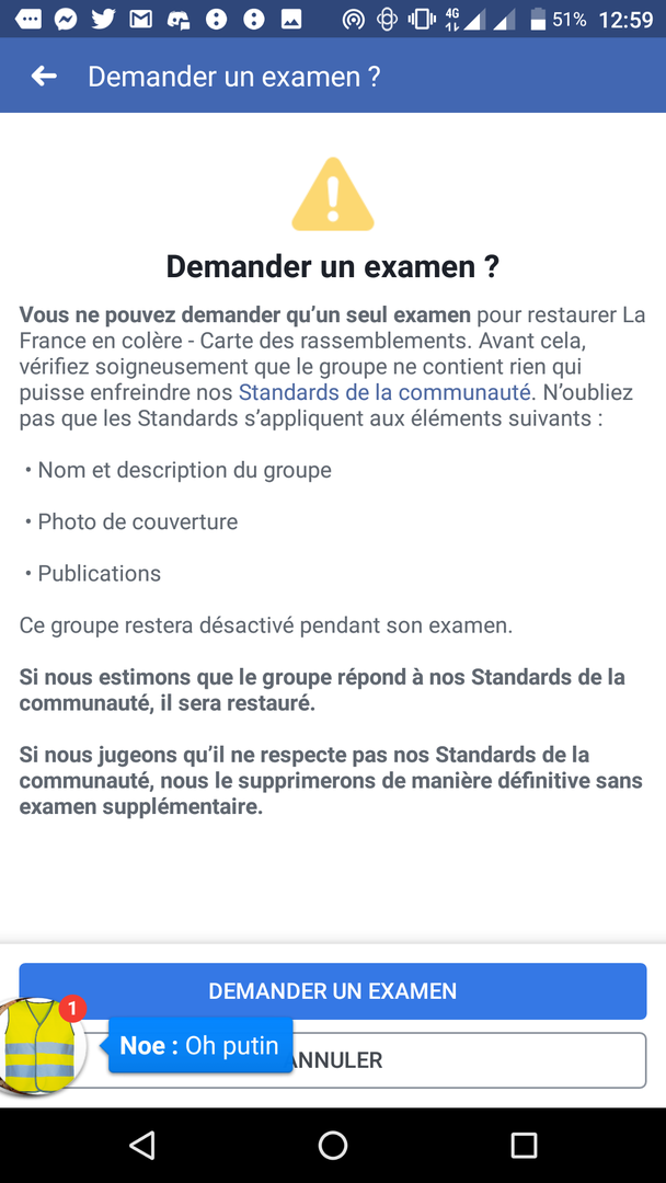 Contacté par RT France, l'un des administrateurs de la page a fait savoir qu'une requête avait été lancée mais que l'interlocuteur du groupe chez Facebook n'avait pas encore répondu.