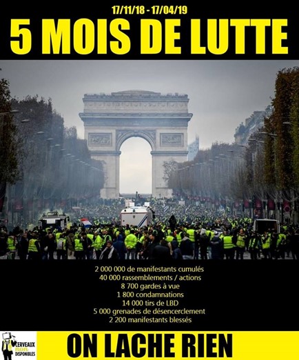 «...Depuis quelques jours, une effervescence presque souterraine traverse le mouvement. Au-delà des mobilisations du samedi, de nombreux citoyens se réunissent et lancent des initiatives : l'appel de Saint-Nazaire, la semaine jaune, le front populaire à partir du 27 avril, des propositions de jonction entre mouvement écolo et GJ, l'occupation des ronds-points avec des banquets à partir du 04 mai, l'appel pour un 1er mai offensif et solidaire... »