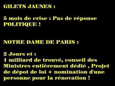 Les dons pour la reconstruction du toit de Notre-Dame affluent de la part des oligarques français. 700 millions d'euros en 3 jours, pour essayer de se refaire une image auprès du peuple. Mais celui-ci ne tombe pas dans le panneau et Joël Giraud, député des Hautes-Alpes, souligne que « les 300 millions de dons annoncés par les familles Arnault et Pinault vont se traduire par 180 millions d'euros de réductions d'impôts, à prélever sur les contribuables lambdas... Car en effet, ces dons sont déductibles d'impôts à hauteur de 60% environ, en fonction des cas... Je demande donc de contrecarrer les volontés émises de voir cette réduction d'impôts portée à 90 % pour Notre-Dame de Paris, même si l'émotion face à ce drame national submerge la planète ». C'est confirmé par cet article du Monde. Donc, finalement, ces 700 millions d'euros seront indirectement remboursés par l'argent du contribuable. Joli coup.