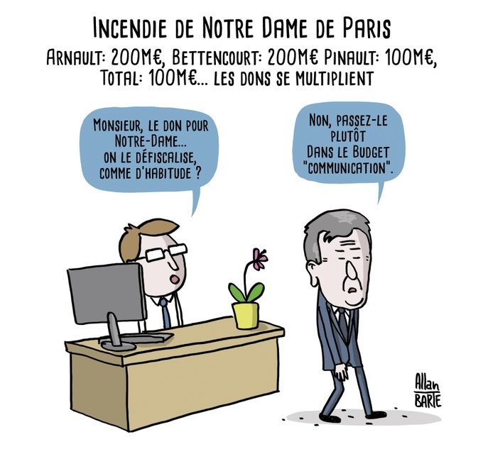 Comme si cela ne suffisait pas, voilà que tous les sauveurs miraculeux de Notre-Dame pourront sur demande bénéficier d'avantageuses réductions d'impôts - tout au moins pour ceux qui ont consenti à en payer en France. Depuis une loi relative au financement des activités culturelles de 2003 (dite « loi Aillagon », du nom du ministre de la Culture du gouvernement Raffarin à l'époque du président Jacques Chirac), les sociétés peuvent déduire 60 % de leurs dépenses en faveur du mécénat, avec possibilité d'échelonnement de déduction fiscale sur plusieurs années.