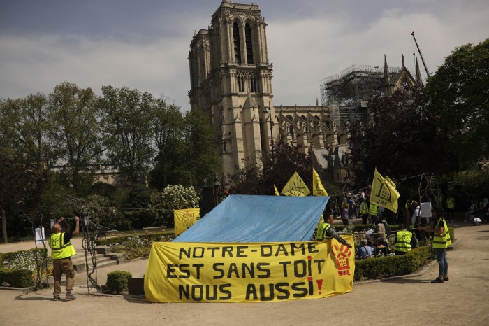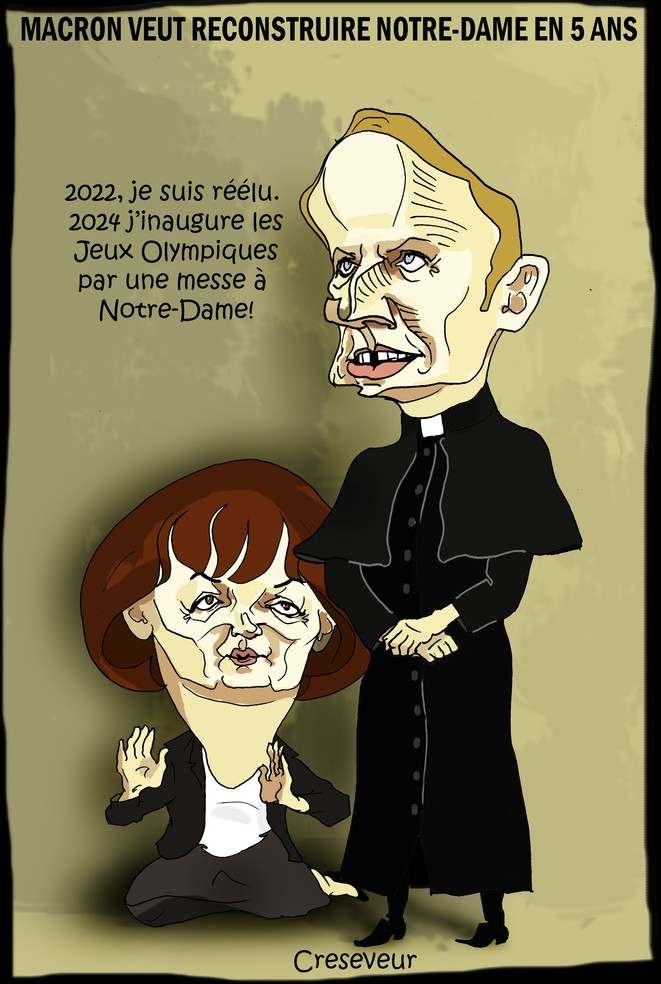 L'incendie n'était pas encore éteint que, au milieu d'une nuée ardente de tweets, les pouvoirs ecclésiastiques et politiques sont apparus pourcommenter le barbecue en direct. L'archevêque de Paris a affirmé que ce qui brûlait était la maison de tous. Nous ne savions pas que c'était la maison de tout le monde, vu que chaque nuit il y a des milliers de sans-abri qui dorment dans la rue et les réfugiés sont constamment expulsés de la ville. Nous pensions que c'était la maison de l'Opus Dei et du tourisme. Les représentants politiques se sont accordés à dire que la cathédrale est l'endroit le plus visité de Paris. Le joyau de l'industrie touristique parisienne était en train de se transforme en scorie. Et puis, comme dans une scène d'opéra avec un décor à l'échelle réelle, la figure du chef de l'Etat est apparue, soulagé de l'inquiétude d'avoir à parler des petits résultats du Grand Débat. Il est dommage que le président ne sache pas chanter aussi bien que les fidèles, car ses paroles semblaient être un hymne national-catholique. Là, devant une cathédrale encore en flammes, il a affirmé, nous l'avons tous entendu : « Nous allons la reconstruire ». Le feu était encore si intense au-dessus de sa tête que quelques cheveux auraient pu être brûlés. Avant l'extinction de l'incendie, le chef de l'Etat avait déjà décrété la reconstruction, annoncé un appel national aux dons et une exonération fiscale pour les riches donateurs.