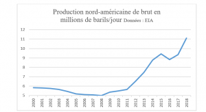 La production de pétrole de l'Arabie saoudite est, depuis quelques années, étirée à sa limite maximale. Afin de baisser les cours pétrolifères les États-Unis d'Amérique ont décidé en 2011, à la suite des printemps arabes, d'envahir les marchés avec leur propre production, celle des réserves stratégiques -à grande profondeur, dans les roches-mères à huile, plus compactes, seulement exploitables par fracturation hydraulique. Les USA sont aujourd'hui premier producteur mondial de brut, surpassant la Russie et l'Arabie saoudite avec environ 12 millions de barils par jour. Ils sont aussi tout en haut de la liste pour le gaz naturel avec 734 milliards de mètres cubes -m³- en 2017.