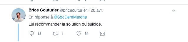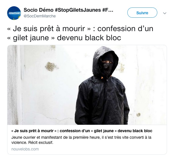 Brice Couturier recommande publiquement, sur Twitter, le suicide à un Gilet Jaune, mais on fait mine de s'indigner quand c'est crié par des manifestants nassés, gazés et frappés des heures durant sur une place transformée en souricière. Tout est filmé, documenté, diffusé, à n'en plus pouvoir.