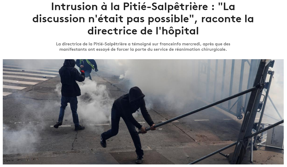 Dans celui-ci, comme son titre l'indique, France Info a récolté le témoignage de la directrice de l'hôpital de la Pitié-Salpêtrière à Paris. Lors de la manifestation du 1er Mai, une trentaine de personnes ont été en effet placées en garde à vue à la suite d'une «intrusion» dans l'enceinte de l'établissement.