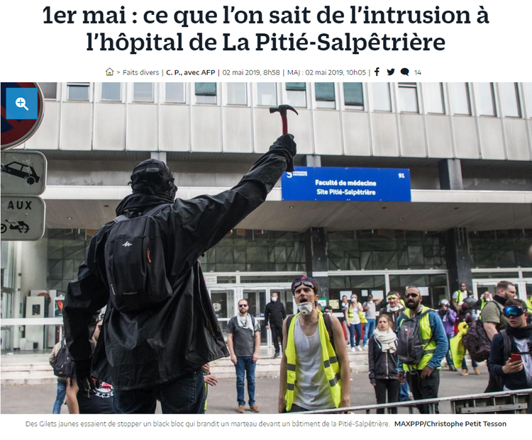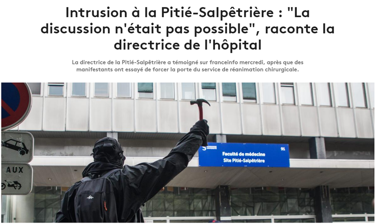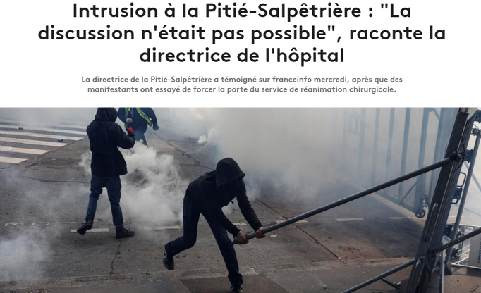La chaîne d'information publique France Info illustre au mieux le rôle de porte-parole de la propagande d'État des médias. Son reportage intitulé «Incidents à la Pitié-Salpêtrière: 'La discussion n'était pas possible', raconte la directrice de l'hôpital», présentait la photo d'un homme à capuche attaquant une porte avec un poteau métallique.