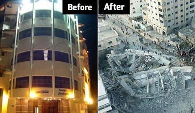 Les missiles israéliens, tirés sur les quartiers densément peuplés de Sheja'eyya, Tuffah, Zeitoun et Rimal à Gaza-ville, ont fait des dégâts considérables aux immeubles d'habitation, de services publics et commerciaux.