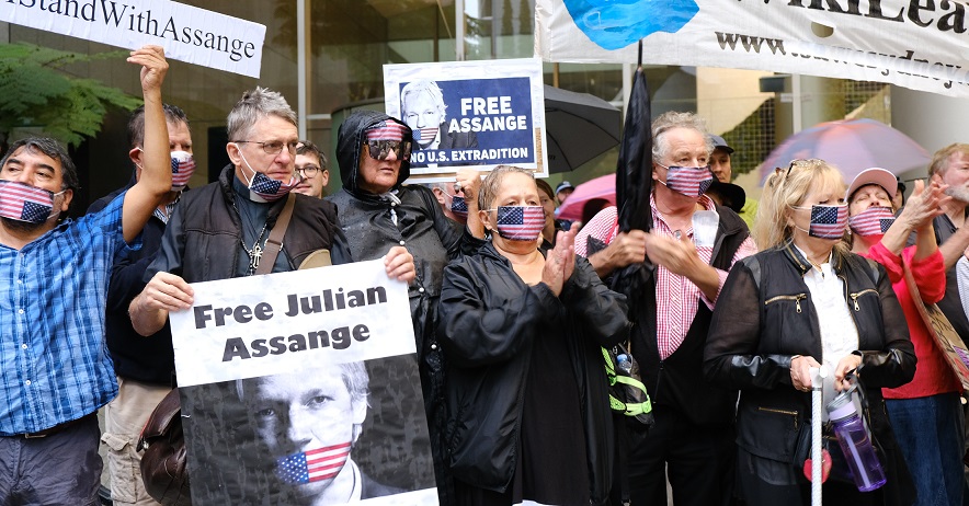 La manifestation de Sydney a eu lieu devant l'ambassade des États-Unis à Martin Place, puis devant le bâtiment voisin du ministère des affaires étrangères et du commerce. La manifestation a eu lieu deux jours après qu'un tribunal britannique a condamné Assange à 50 semaines de prison pour de fausses accusations qu'il a violé les conditions de sa libération sous caution.