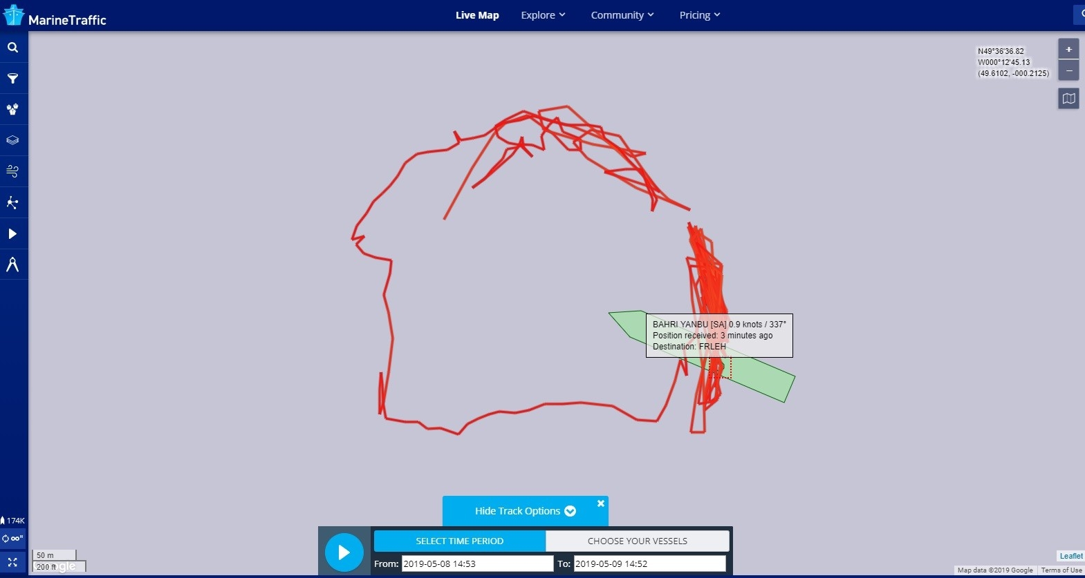 Les mouvements circulaires opérés par le cargo depuis 24h, qui ne se rend pas au port du Havre comme prévu.