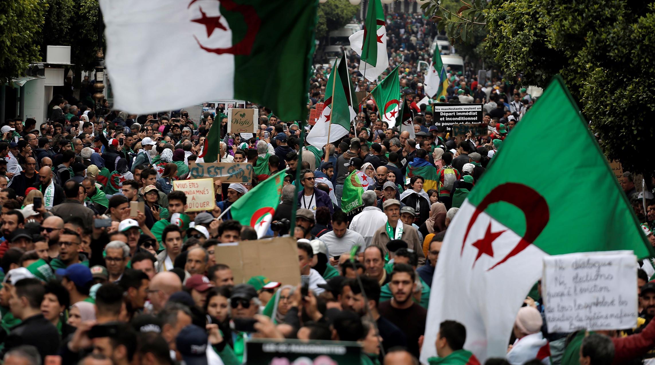 Des manifestants anti-gouvernementaux à Alger le 3 mai.Les manifestations de masse contre le régime se sont intensifiées depuis la destitution de Bouteflika. Des milliers de personnes ont encore défilé le vendredi 10 mai à Alger, Oran, Sétif, Constantine et dans d'autres grandes villes du pays, pour la douzième semaine consécutive et la première fois depuis le début du Ramadan. Les manifestants rejettent la convocation de nouvelles élections présidentielles le 4 juillet supervisées par le président intérimaire Abdelkader Bensalah et le Premier ministre Noureddine Bedoui, de proches alliés de longue date de Bouteflika,.