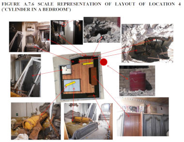 Pour tous ceux qui ont un peu de connaissance du comportement physique du béton et du métal, il était évident que les dommages causés sur le béton et sur les bouteilles étaient incompatibles l'un avec l'autre. Le béton, renforcé avec de l'acier, a été complètement transpercé alors que les bouteilles ne présentaient que des dommages minimes. Les toits ont probablement été percés par l'impact de l'artillerie, tandis que les bouteilles ont probablement été placées à la main.