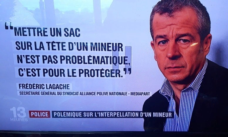 Un jeune homme, la tête recouverte d'un sac de tissu blanc, menotté et plaqué contre la devanture d'un restaurant par un policier. Cette interpellation sidérante a été enregistrée par une passante, le 9 mars, dans le XXe arrondissement, à Paris. Choquée et redoutant d'éventuelles représailles des forces de l'ordre, elle n'a pas souhaité s'exprimer mais a tenu à transmettre cet enregistrement que Mediapart diffuse. Voici la réponse du syndicat policier majoritaire (c'est-à-dire financé par l'État, c'est-à-dire par l'argent du contribuable) face à cette affaire :