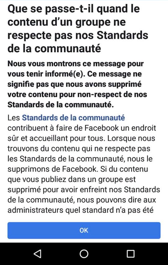 Facebook étant la plate-forme de partage numéro 1 des Gjs, la censure commence et le message suivant apparaît de plus en plus sur les murs des Groupes Gjs :
