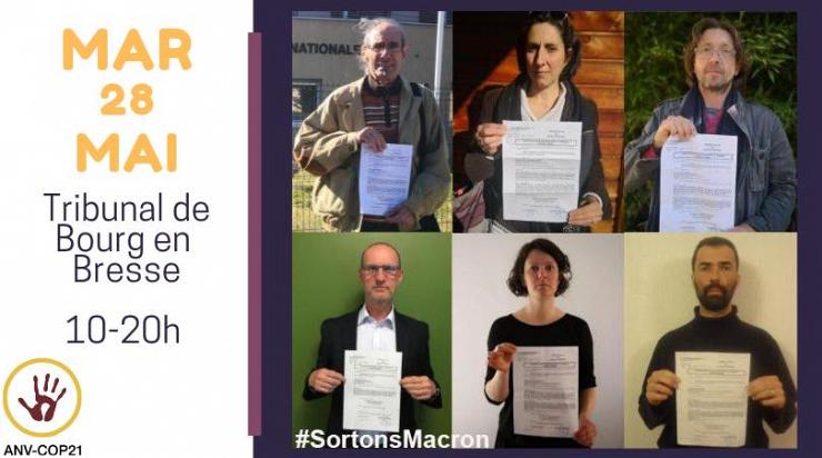 Le 28 mai à 13h30, six militants du groupe « ANV-COP21 / Alternatiba - Beaujolais Val de Saône » sont convoqués au tribunal de grande instance de Bourg-en-Bresse pour le premier procès d'une longue série à venir. Chacun⋅e risque cinq ans de prison et 75 000 euros d'amende. Enseignant·e, retraité·e, cadre supérieur⋅e, consultant·e libéral⋅e, entrepreneur·se, leur diversité témoigne de ce que la prise de conscience de l'urgence à agir touche tout le monde.