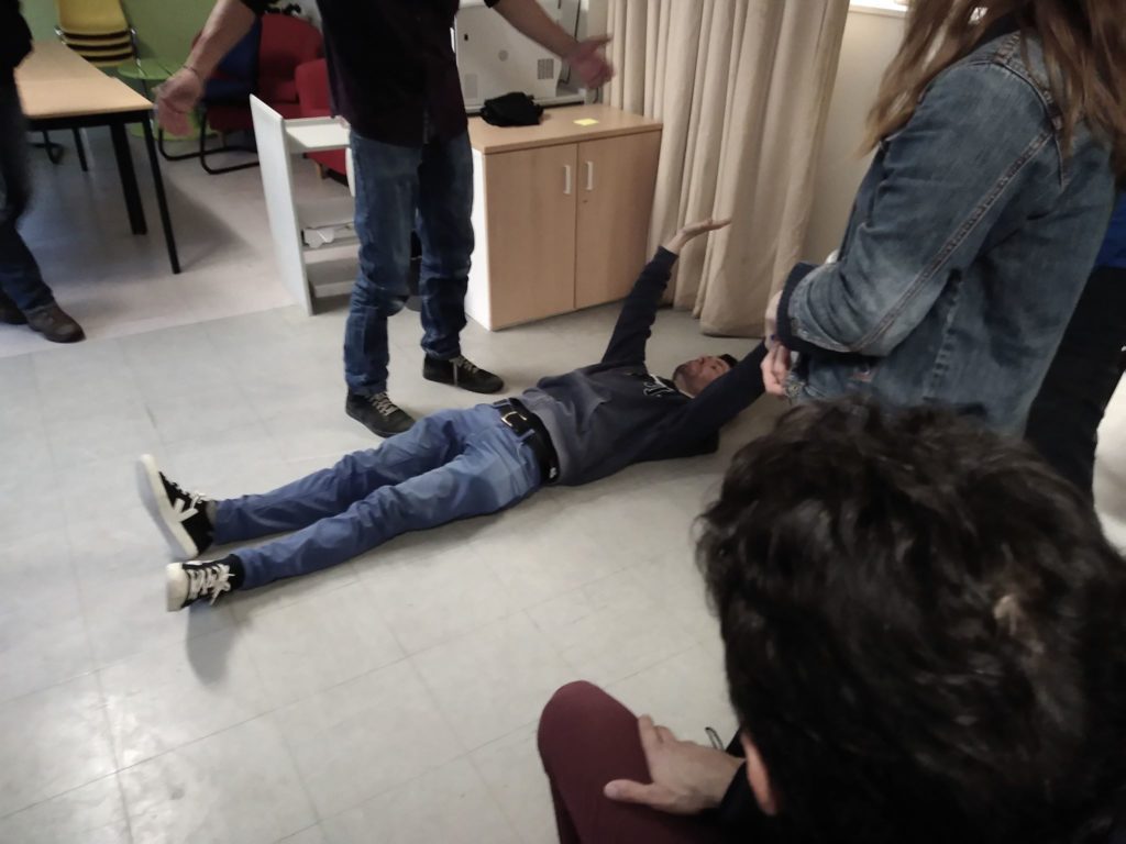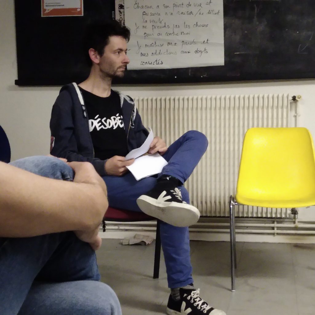 La soirée commence par un exercice « Vous bloquez le salon de l'armement et la police arrive, mettez en place une stratégie pour réagir » explique Rémi. Voilà qui est concret. Le groupe est scindé en deux, d'un côté les manifestants et de l'autre les policiers. La mise en scène se met en place. Les manifestants sont au sol, simulant un « die in » tandis qu'un porte parole désigné attend la police, le groupe représentant les forces de l'ordre et mené par Rémi arrive : « Il se passe quoi ici ? C'est qui le responsable ? » demande t-il. Le porte parole, sourire aux lèvres répond « On est tous responsable, moi, vous », Rémi, visiblement confortable dans son rôle de Policier le coupe immédiatement « On a un petit rigolo, embarquez moi ça ».