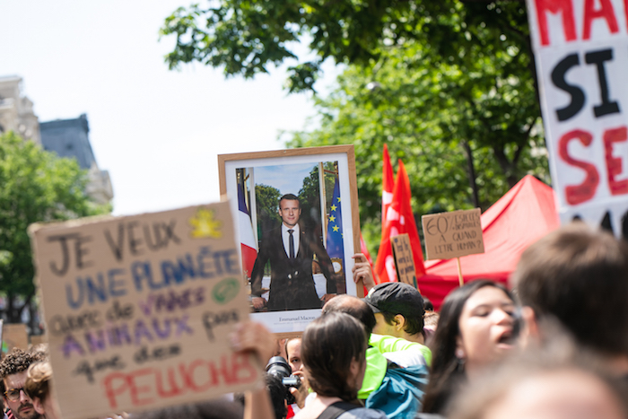 Vers 15 heure, un invité surprise s'est glissé dans le cortège. 130 activistes ont exhibé le portrait d'Emmanuel Macron, décroché le matin même à la mairie du 19 e arrondissement. Une manière de ridiculiser celui qui s'était sacré « champion de la Terre ».