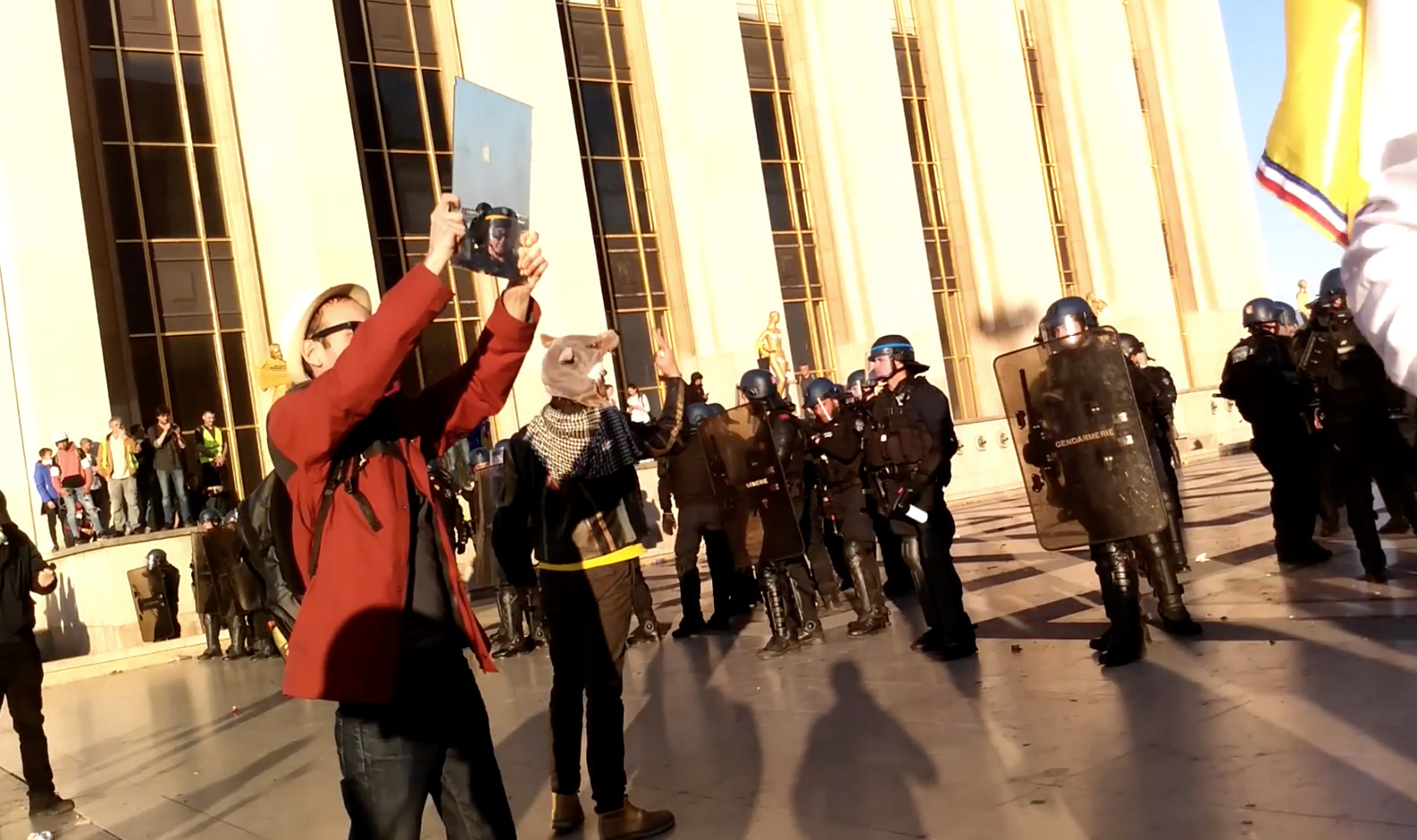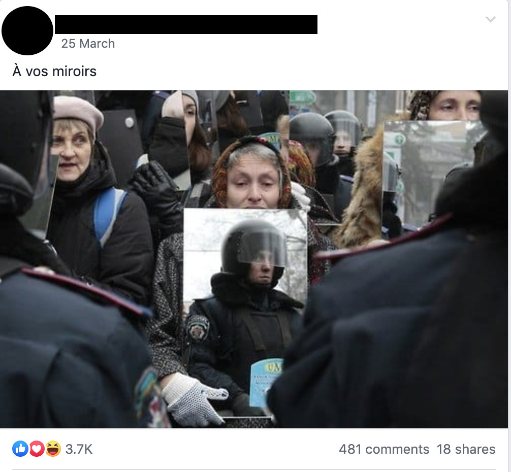 A vivid example: on March 30th I witnessed (at the 2:20 mark in this video) someone literally replicating a Nuland NGO media trick - holding a mirror in front of the police. How so?