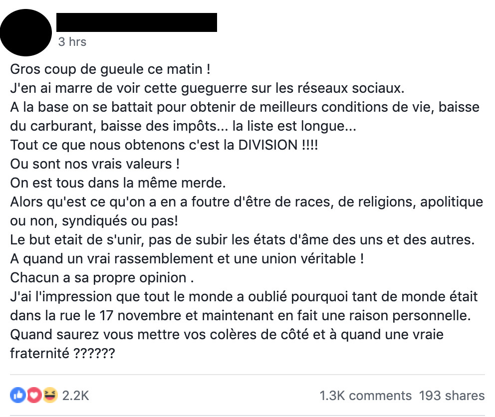Thus, the method that has proven to be the most effective given the circumstances is to organise a sanctioned protest and then start a riot. Even if the approved assembly point(s) and route are boxed in by the cops from start to finish, the protestors at least have the chance to form a large crowd. I stumbled across this balanced/grounded Facebook comment (I censored the author's name and profile picture) on May 26th that offers a window into the thinking of the average Yellow Vest after the end of this experiment: