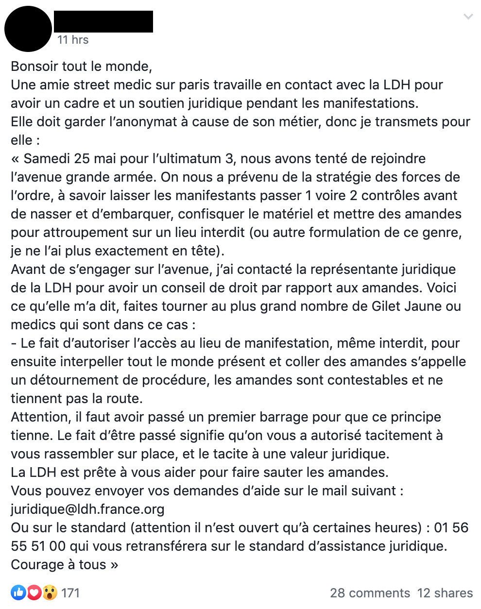 A friend street medic in Paris is in contact with the LDH to have framework and legal support during demonstrations.