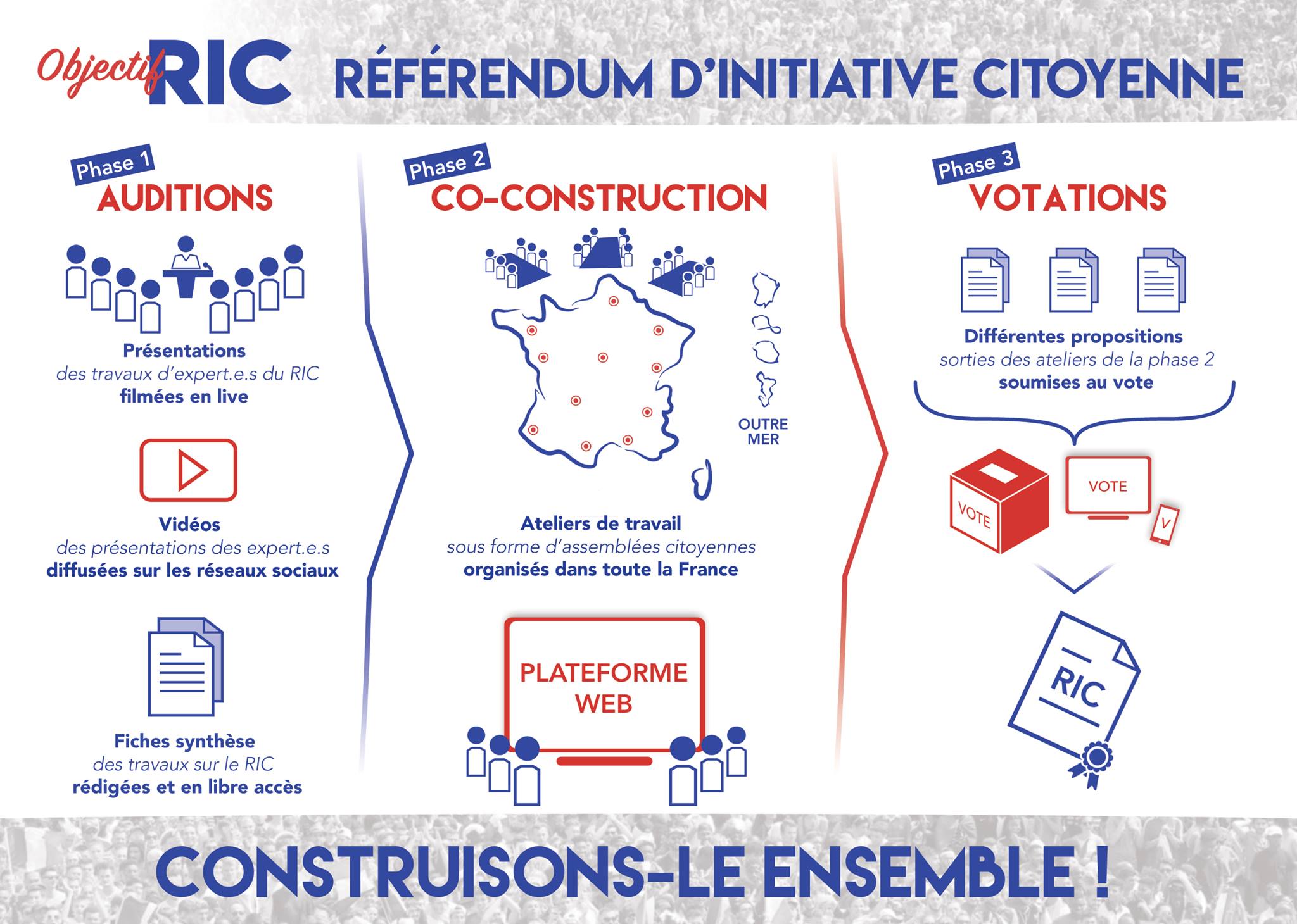 The point here is that no concrete form has been decided on, since matters are still at the experimental stage. The infographic below, created by the "Objectif RIC" organisation (which is 100% citizen activism), divides the process of implementation into 3 stages: inform, assemble, vote.