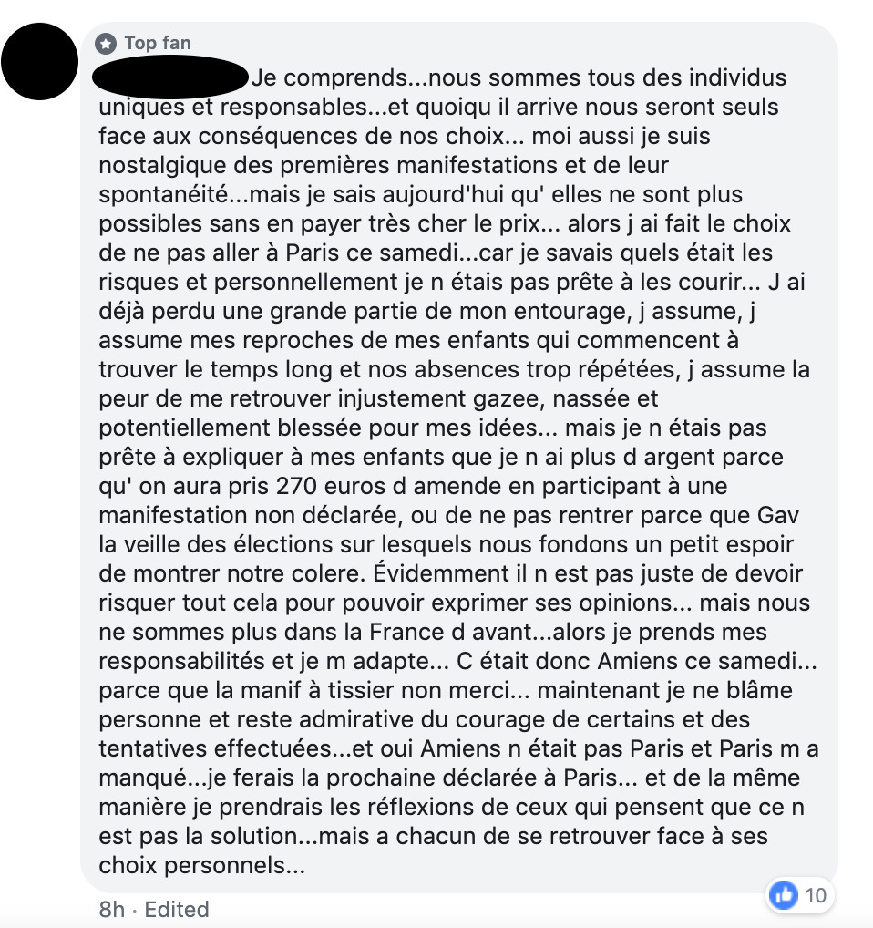 "I understand... we are all unique and responsible individuals... and whatever happens we will be alone with the consequences of our choices... I also am nostalgic of the first demonstrations and their spontaneity... but I know today that they are no longer possible without paying a very high price... so I made the choice not to go to Paris this Saturday... because I knew what the risks were and I was personally not ready to run them... I have already lost a large part of my entourage, I assume, I receive complaints from my children who are starting to find the time to be long and our absence too frequent, I assume the fear of finding myself unjustly gassed, encircled, and potentially hurt for my ideas... but I was not ready to explain to my children that I have no more money because we will have incurred a €270 fine by participating in an unsanctioned demonstration, or not go home due to being detained on the day before the [EU] elections on which we base a small hope to show our anger. Obviously it is not right to have to risk all that in order to be able to express our opinions... but we are no longer in France of before... so I take my responsibilities and I adapt... So I went to [the sanctioned protest in] Amiens this Saturday... because the demo of [Sophie] Tissier [a fake Yellow Vest who always registers sanctioned protests in order to split the Yellow Vests up on Saturdays. I don't know if she is a conscious saboteur or just an idiot, but her demos are a total waste of time - O.R] - no thank you... now I do not blame anyone and remain an admirer of the courage of some and attempts made... and yes Amiens was not Paris and Paris missed me... I will come to the next sanctioned protest in Paris... and in the same way I will take onboard the reflections of those who think that this is not the solution... but everyone has to face their personal choices..."