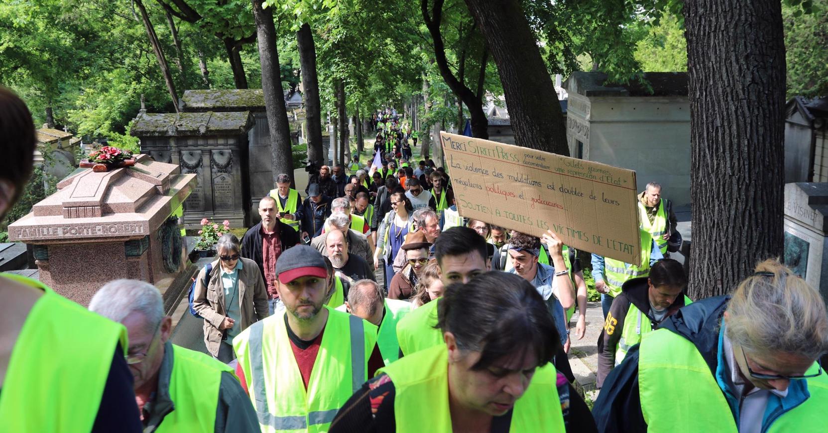 Des gilets jaunes défilent à travers le cimetière du Père-Lachaise vers le Mur des communardsPlus de 100 personnes ont chanté l'Internationale, le chant de la solidarité internationale des travailleurs, devant le mur.