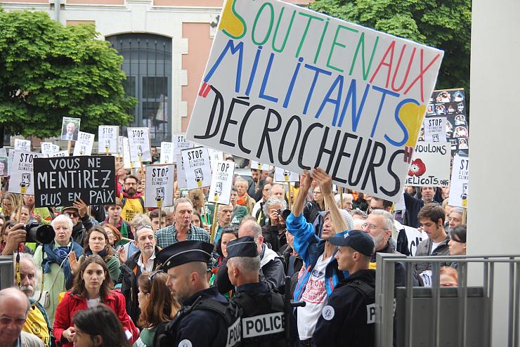 « Le procureur a dit que nous avions voulu instrumentaliser la justice. Je tiens à rappeler ce n'est pas nous qui avons choisi la voie judiciaire. On se défend, on ne fuit pas nos responsabilités », souligne l'avocat Thomas Fourrey qui demande la relaxe, y compris pour le refus de prélèvement ADN. « Dans une société démocratique, on n'a pas à ficher des militants », plaide sa consœur. Le délibéré est fixé au 12 juin. À l'extérieur, toute la journée a été émaillée par quinze nouvelles actions de décrochages ce qui porte le compteur à 55 portraits au total. Surprise : parmi les décrocheurs figure Paul Vernay, le maire écologiste de Pérouges dans l'Ain, qui a lui-même amené le portrait à la sortie du tribunal. Ce jour là, à Bourg-en-Bresse, il n'y avait non pas un mais plusieurs héros du climat.