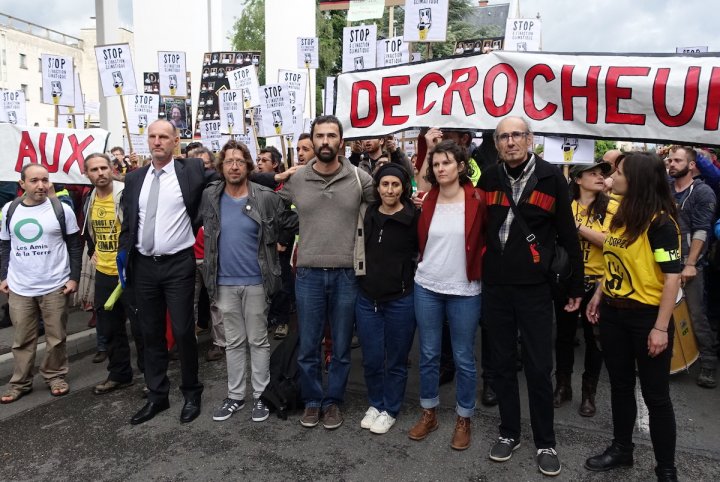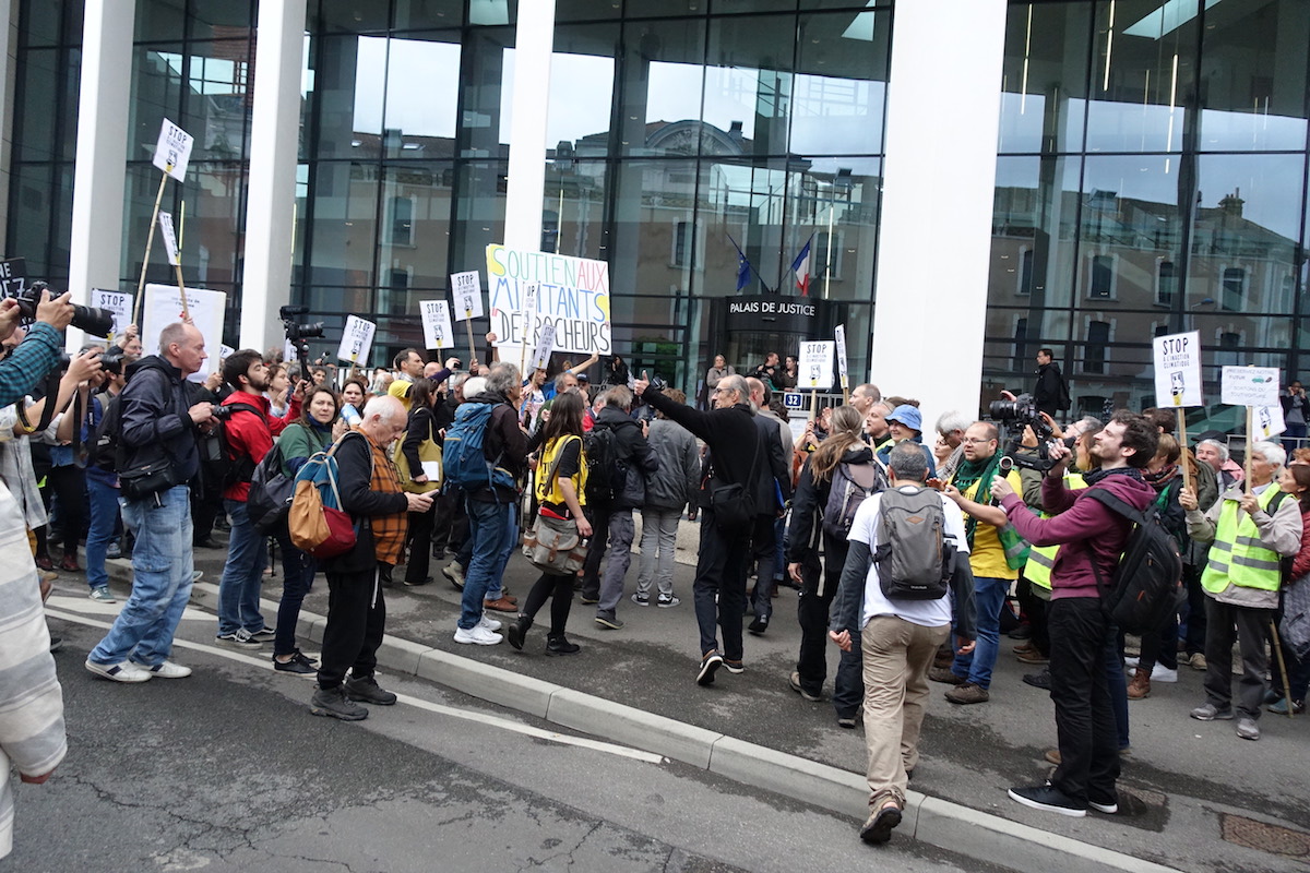 Aux alentours de 12 h 30, le cœur de Bourg-en-Bresse palpite au son cadencé de percussions. Des centaines de voix résolues s'élèvent dans l'avenue Alsace-Lorraine. « Nous sommes tous des décrocheurs de portraits », crient des citoyens venus soutenir les activistes. Le refrain est énergiquement perpétué jusqu'au parvis de palais de justice. Là, la foule se scinde pour laisser passer les prévenus et leur faire une acclamation vibrante.