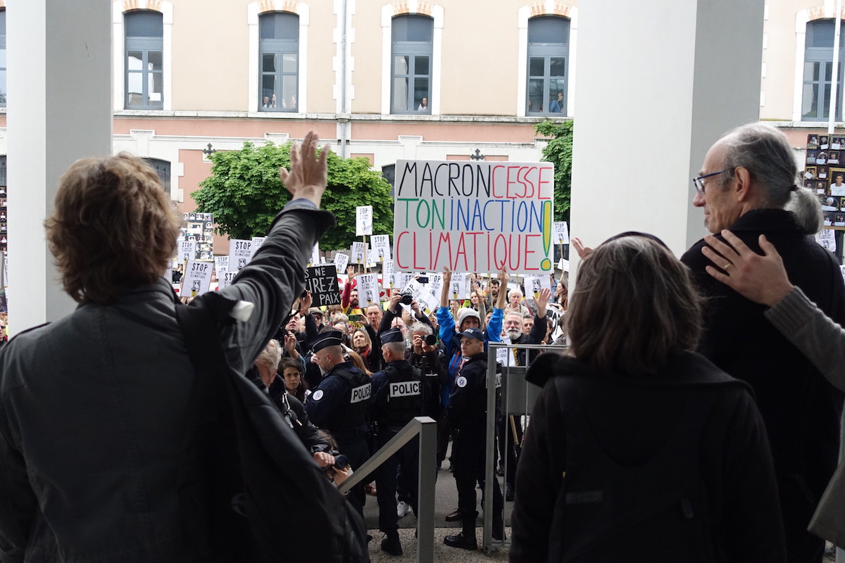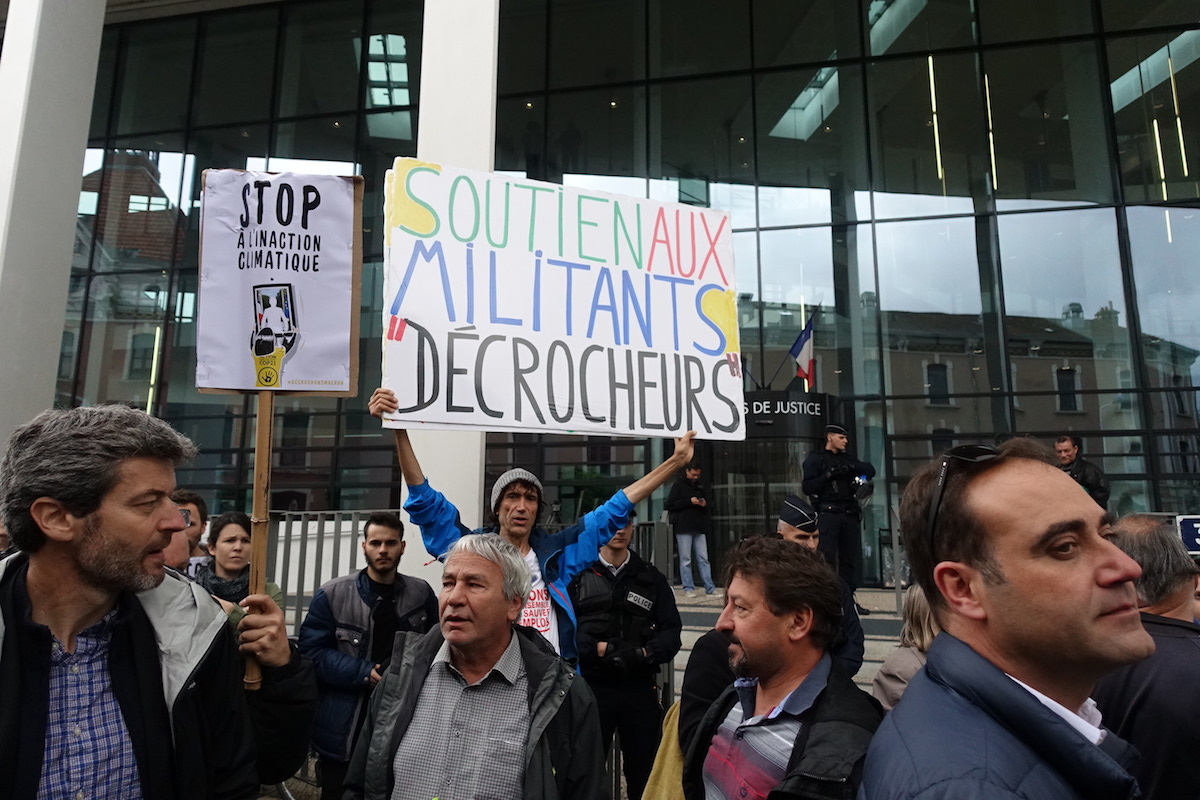 Mardi 28 mai s'est déroulé le premier procès des « décrocheurs » de portraits d'Emmanuel Macron. Le procureur a regretté « l'instrumentalisation » des tribunaux en « tribune politique », et s'est appuyé sur le climato-scepticisme de M. Trump. Autour du tribunal, les manifestations de soutien aux décrocheurs ont été nombreuses.